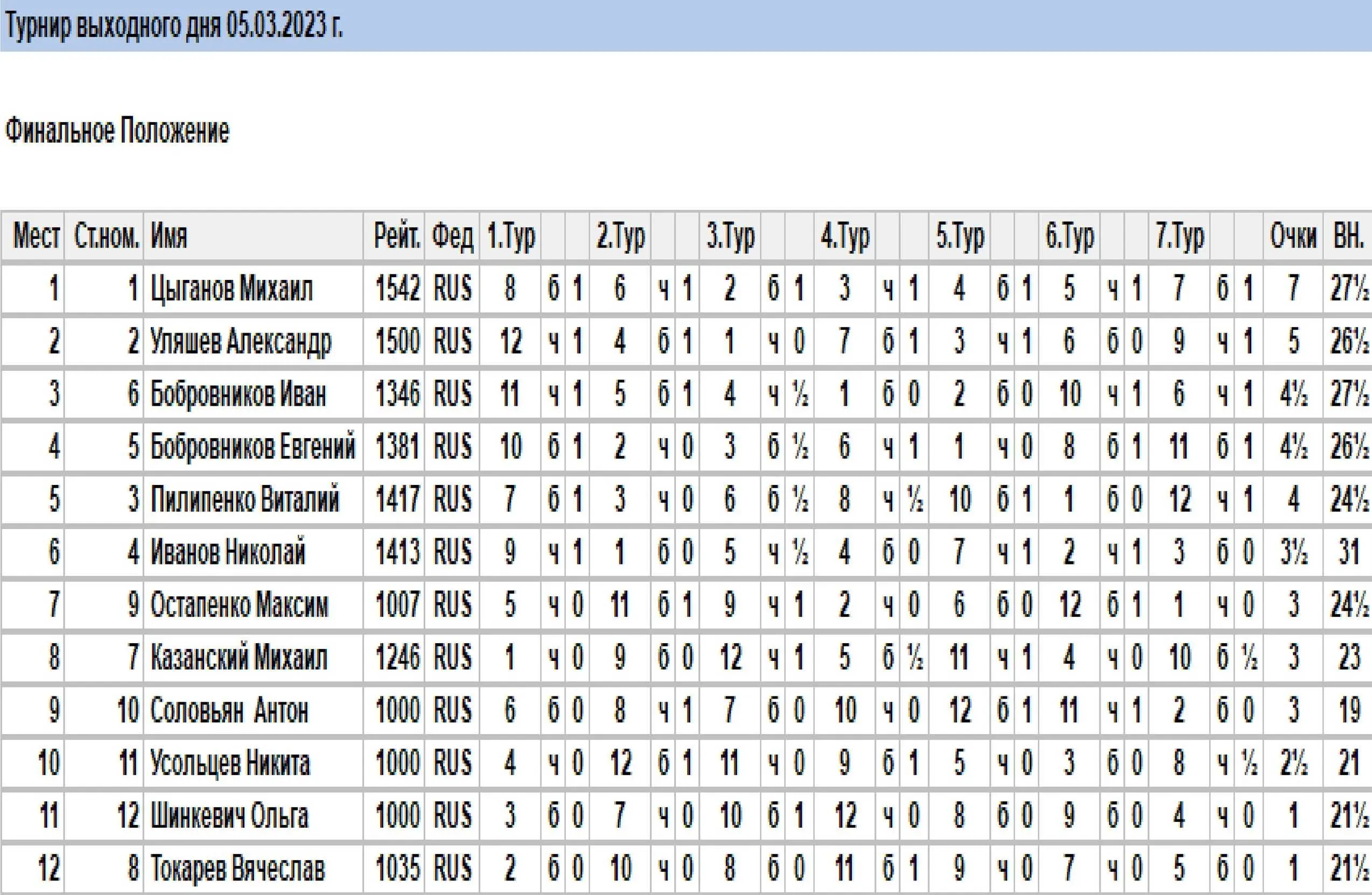 В воскресенье, 5 марта, в Омском городском шахматном клубе на Дмитриева прошел традиционный турнир выходного дня по быстрым шахматам для всех желающих. Контроль 10+5. Туров 7. Количество участников 12.