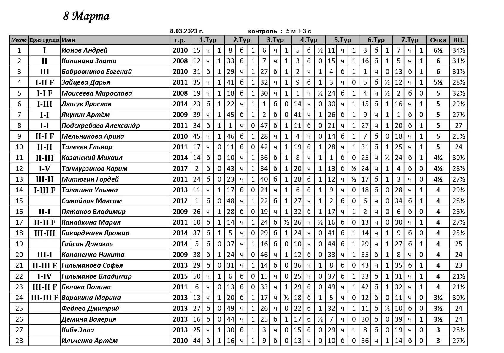 Утром 8 марта в ГШК на Дмитриева прошел детский праздничный блиц. Контроль 5+3, туров 7. Количество участников 50. К участию допускались дети и подростки 2007 года рождения и младше.
