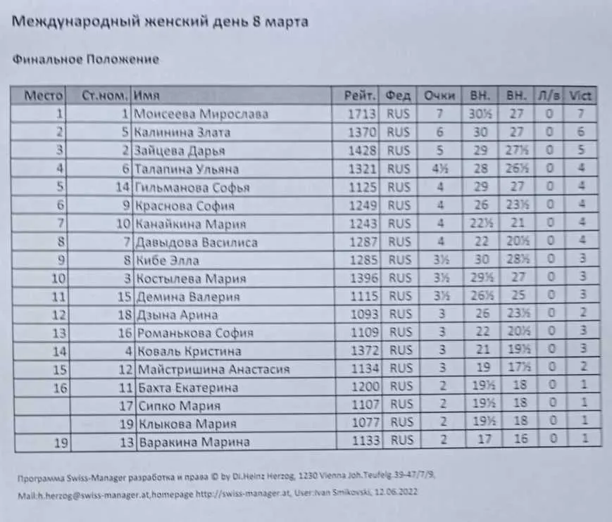 В ДЮСШ №15 прошел турнир для девочек и девушек, посвященный Международному женскому дню. На праздничный турнир приглашались девочки и девушки 2006 года рождения и моложе, имеющие рейтинг ФШР выше 1050. Соревнование по быстрым шахматам собрало 19 участниц. Контроль 8+3, туров 7.