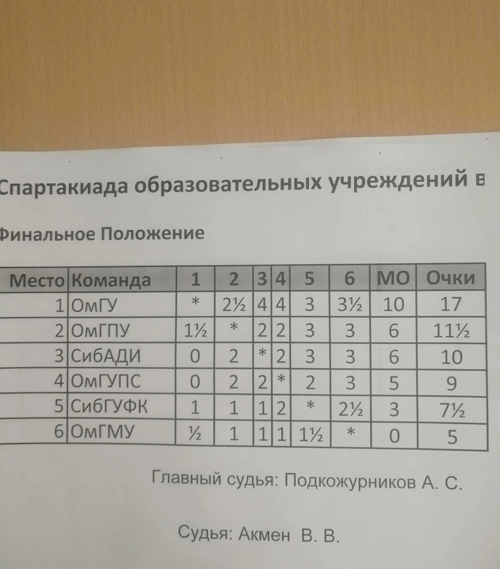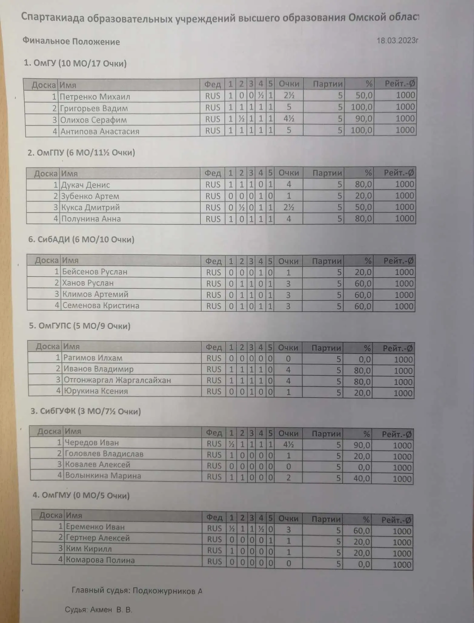 Итоги спартакиады ВУЗов по шахматам (18 марта 2023 г.)