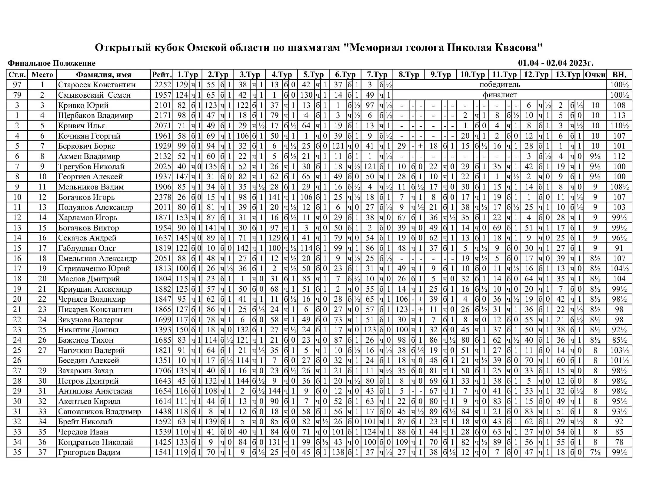 В молодежном пространстве «306 квадратов» на первом этаже Омской государственной областной научной библиотеки им. А.С. Пушкина состоялся традиционный Открытый кубок Омской области по быстрым шахматам «Мемориал геолога Николая Квасова». Допускались все желающие с рейтингом ФШР > 1100. Контроль 10+5. Туров 13. Количество участников 159.