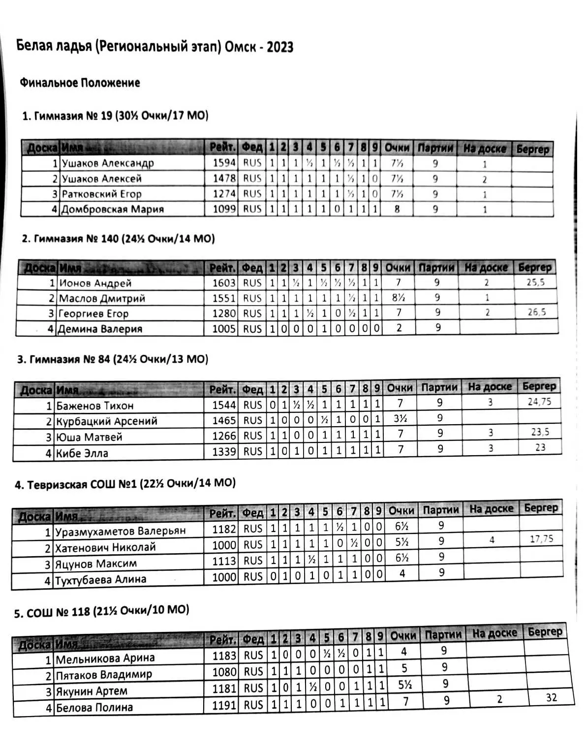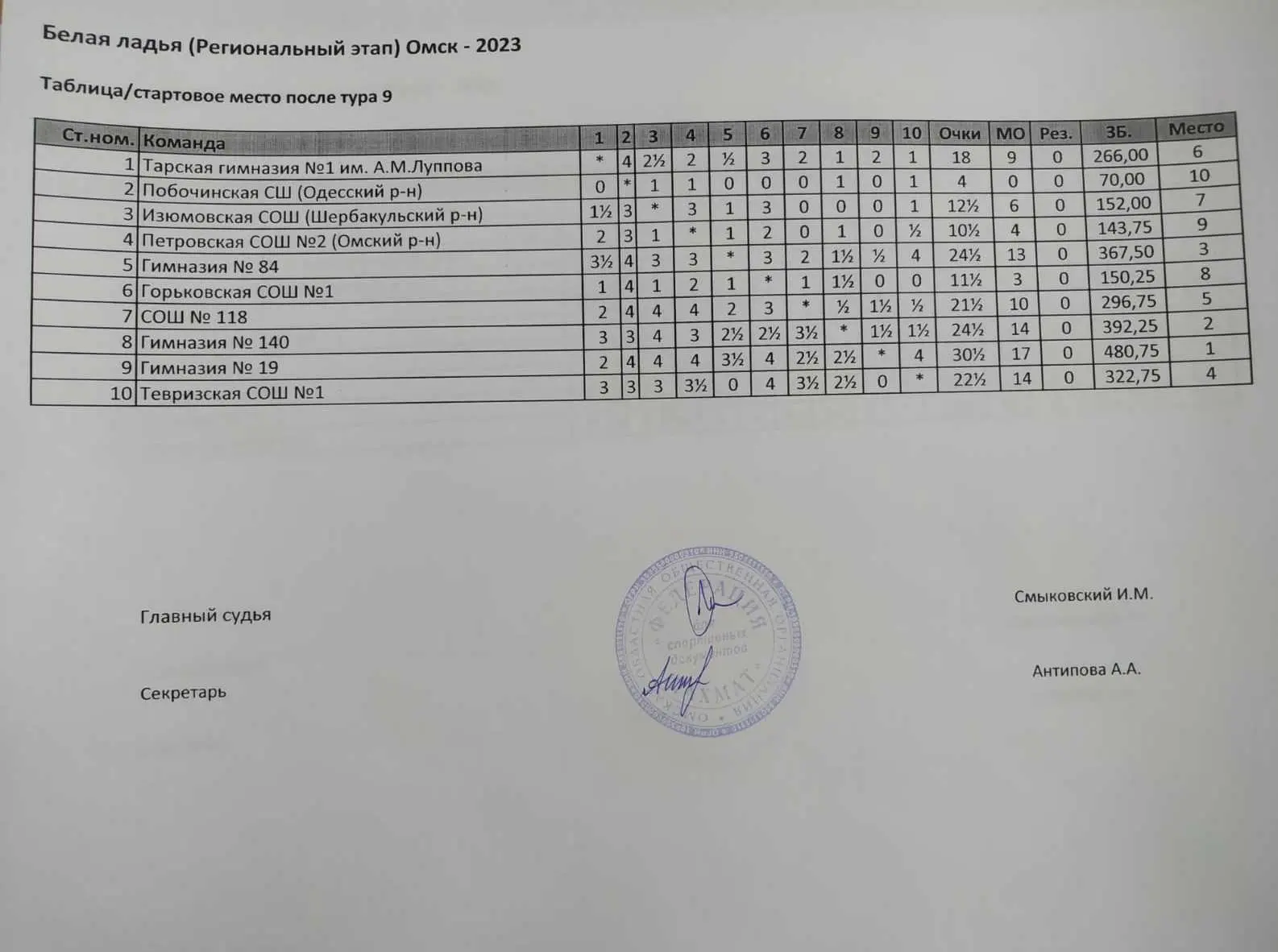 С 7 апреля по 9 апреля в Омске состоялся региональный этап открытых Всероссийских соревнований по шахматам «Белая ладья» среди сильнейших команд общеобразовательных организаций города Омска и Омской области. Составы команд сформированы из учащихся 14 лет и моложе (2009 г.р. и младше): 3 мальчика + 1 девочка. Количество команд: 10 (4 из Омска, 6 из районов Омской области). Круговая система. Контроль 45+15