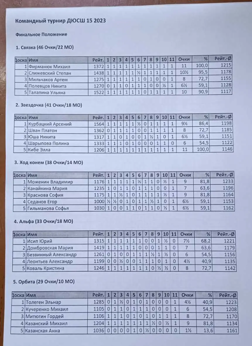 В ДЮСШ №15 прошел командный турнир по быстрым шахматам на 5 досках. Составы команд формировались из воспитанников 2011 года рождения и младше: 4 мальчика + 1 девочка. Контроль 8+3. Количество команд 12. Круговая система.