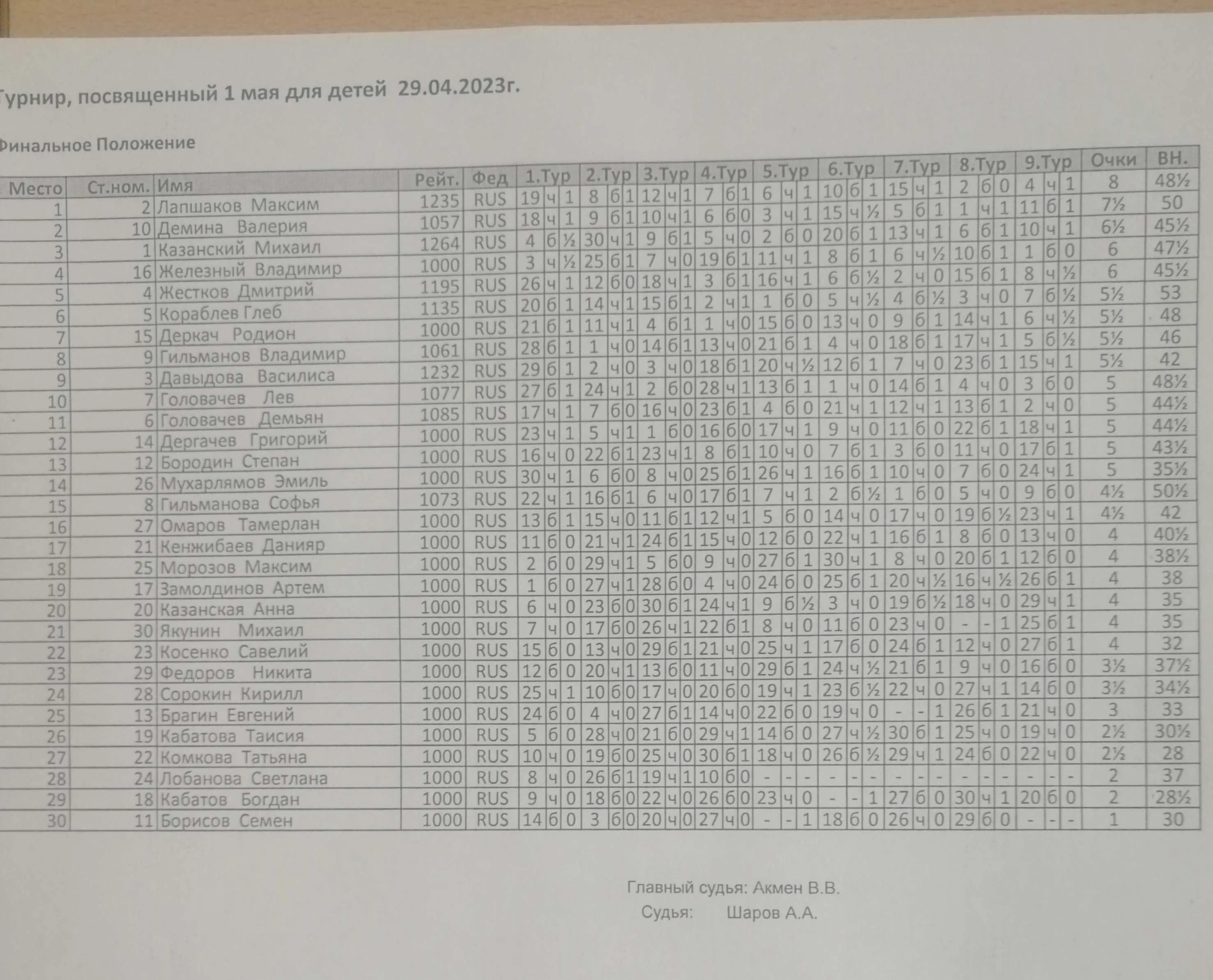 В Омском городском шахматном клубе на Дмитриева провели детский блиц-турнир, посвященный празднику весны и труда. К участию допускались игроки 2007 года рождения и младше. Контроль 5+3. Количество участников 30. Туров 9.