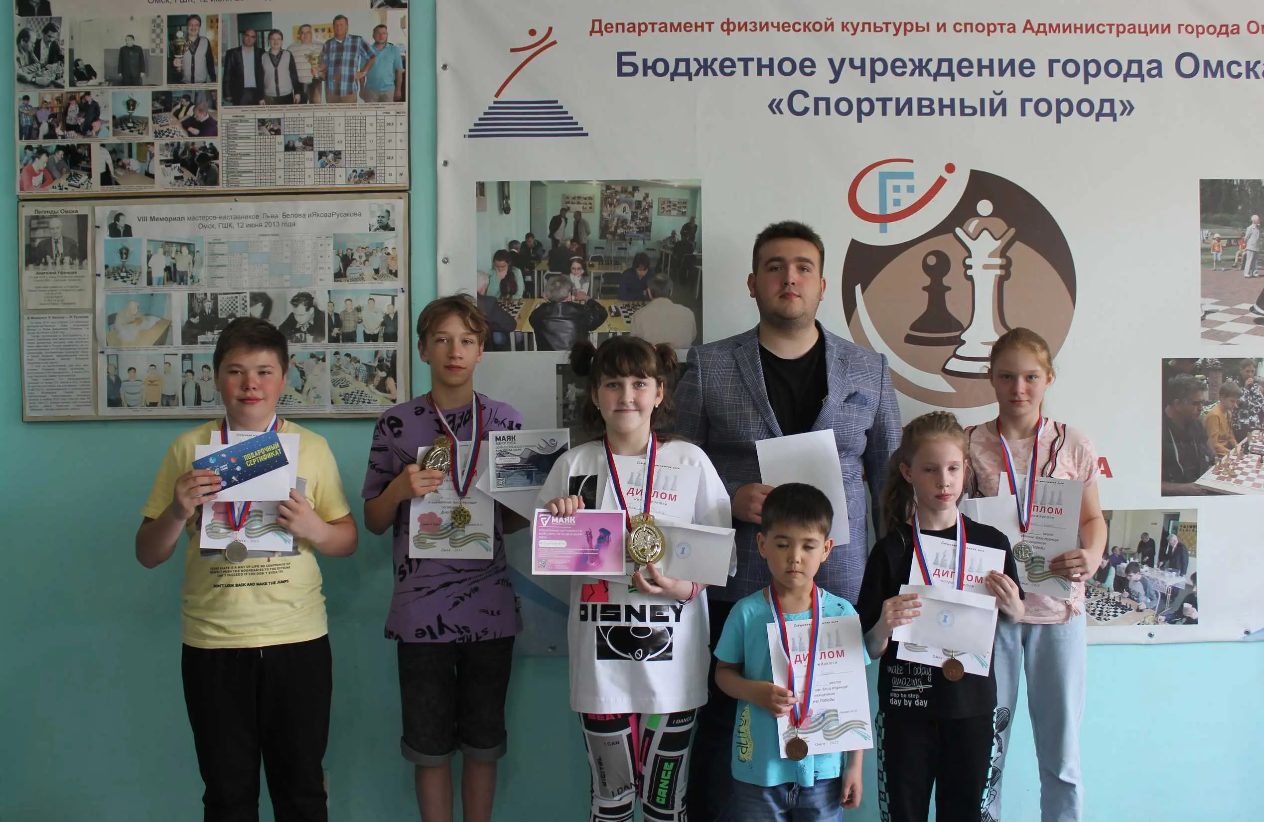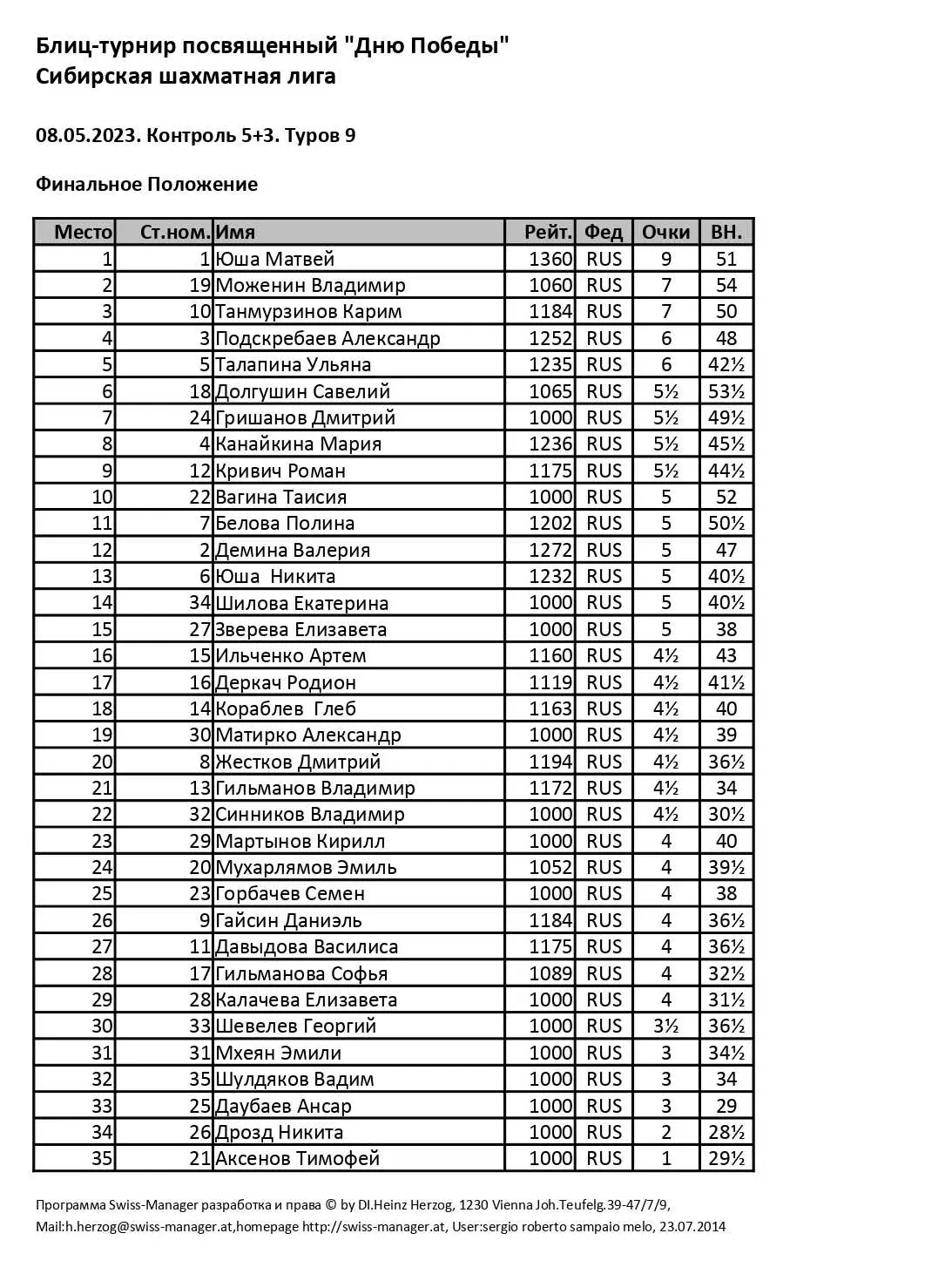 Сибирская шахматная лига провела в ГШК на Дмитриева блиц-турнир для детей, посвященный Дню Победы. Контроль 5+3. Туров 9. Количество участников 35.