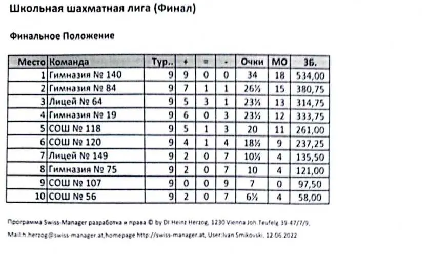 В выходные в ДЮСШ №15 состоялся финальный этап командного первенства «Школьная лига» по шахматам. Ему предшествовали отбор в команду внутри школ и борьба между образовательными учреждениями внутри округов, которые проходили в течение учебного года. В финал попадали 2 сильнейших коллектива из каждого округа города Омска. Контроль 10+5. Количество команд 10. Круговая система.