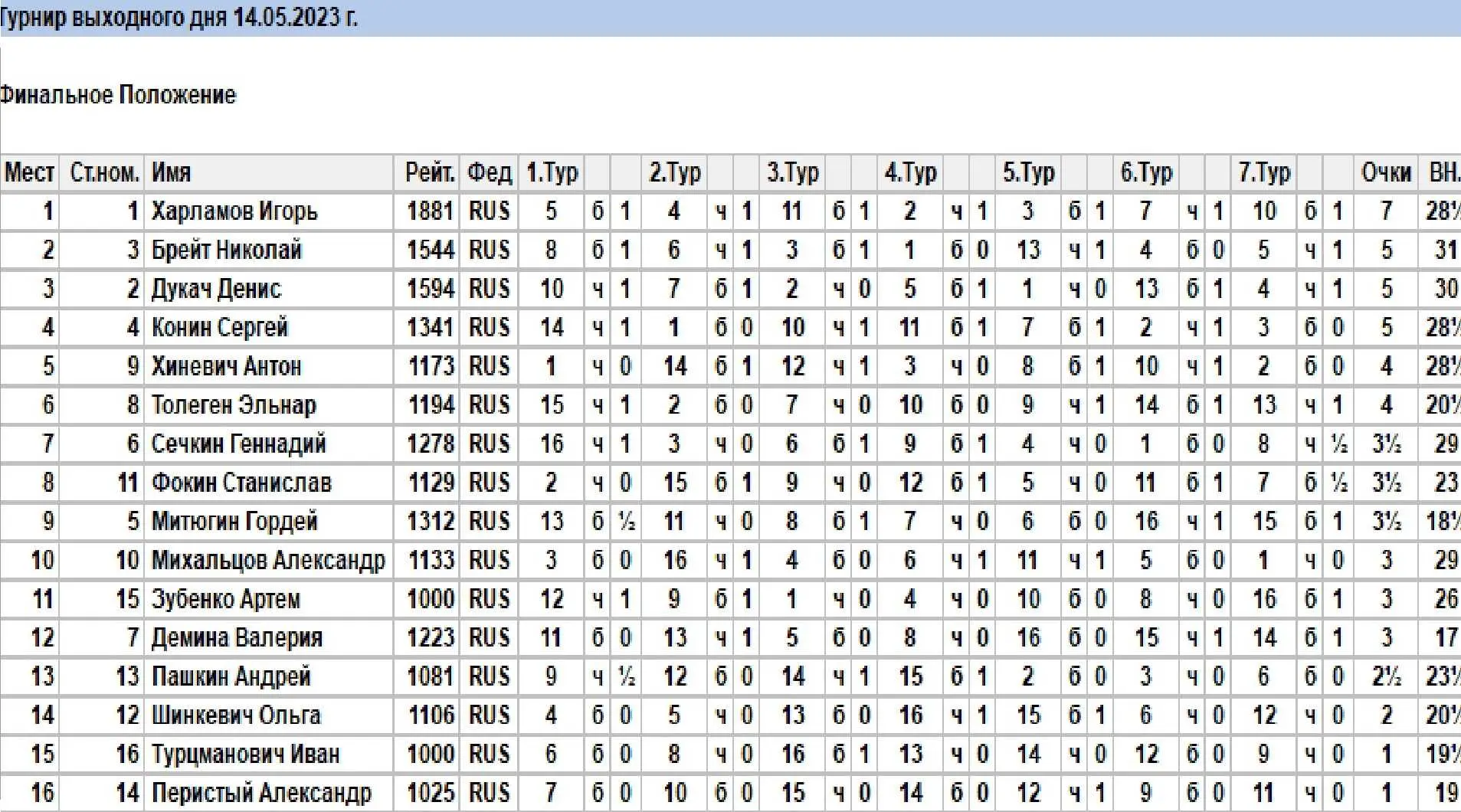 Итоги турнира по быстрым шахматам (14 мая 2023 г.)