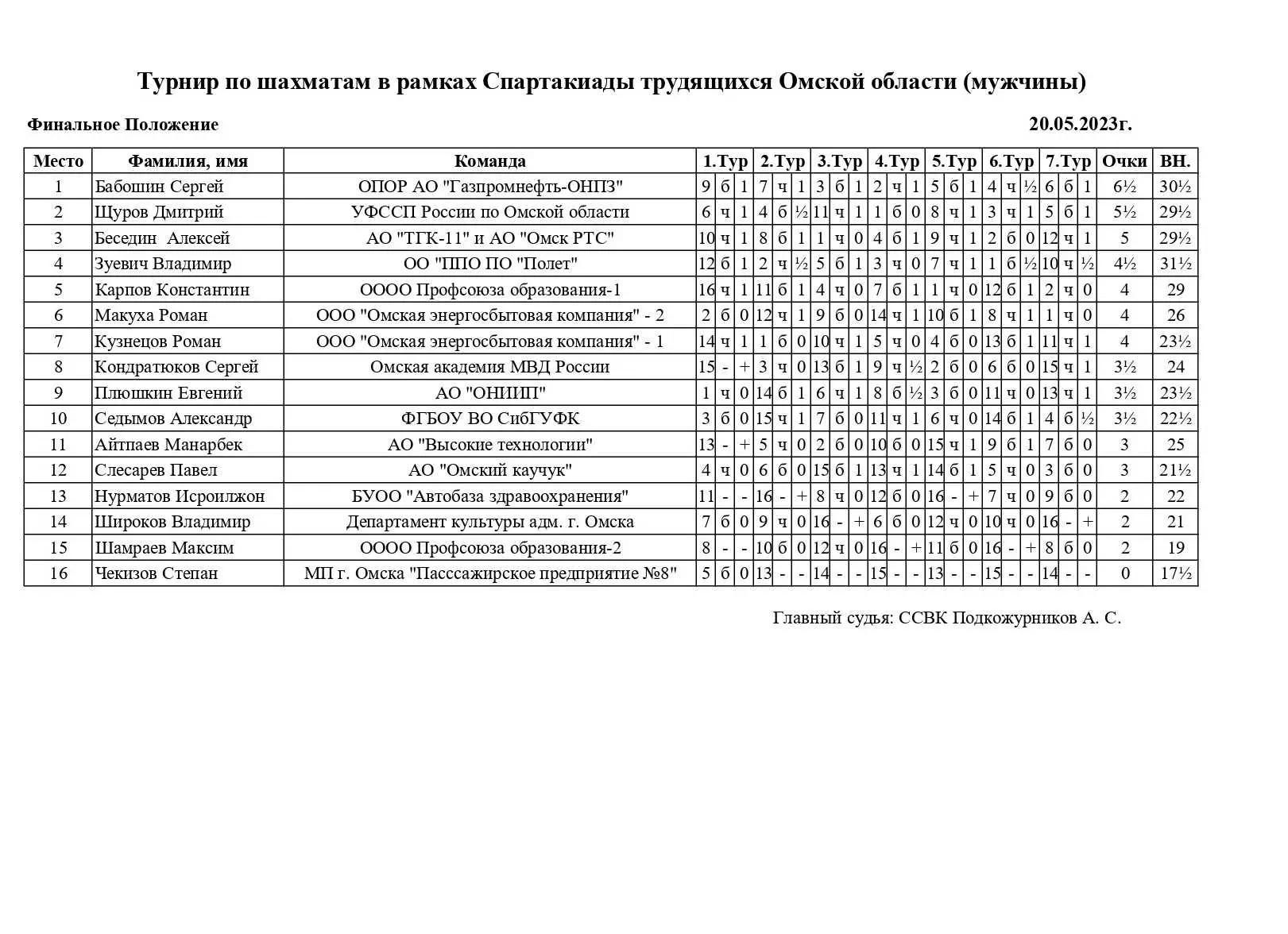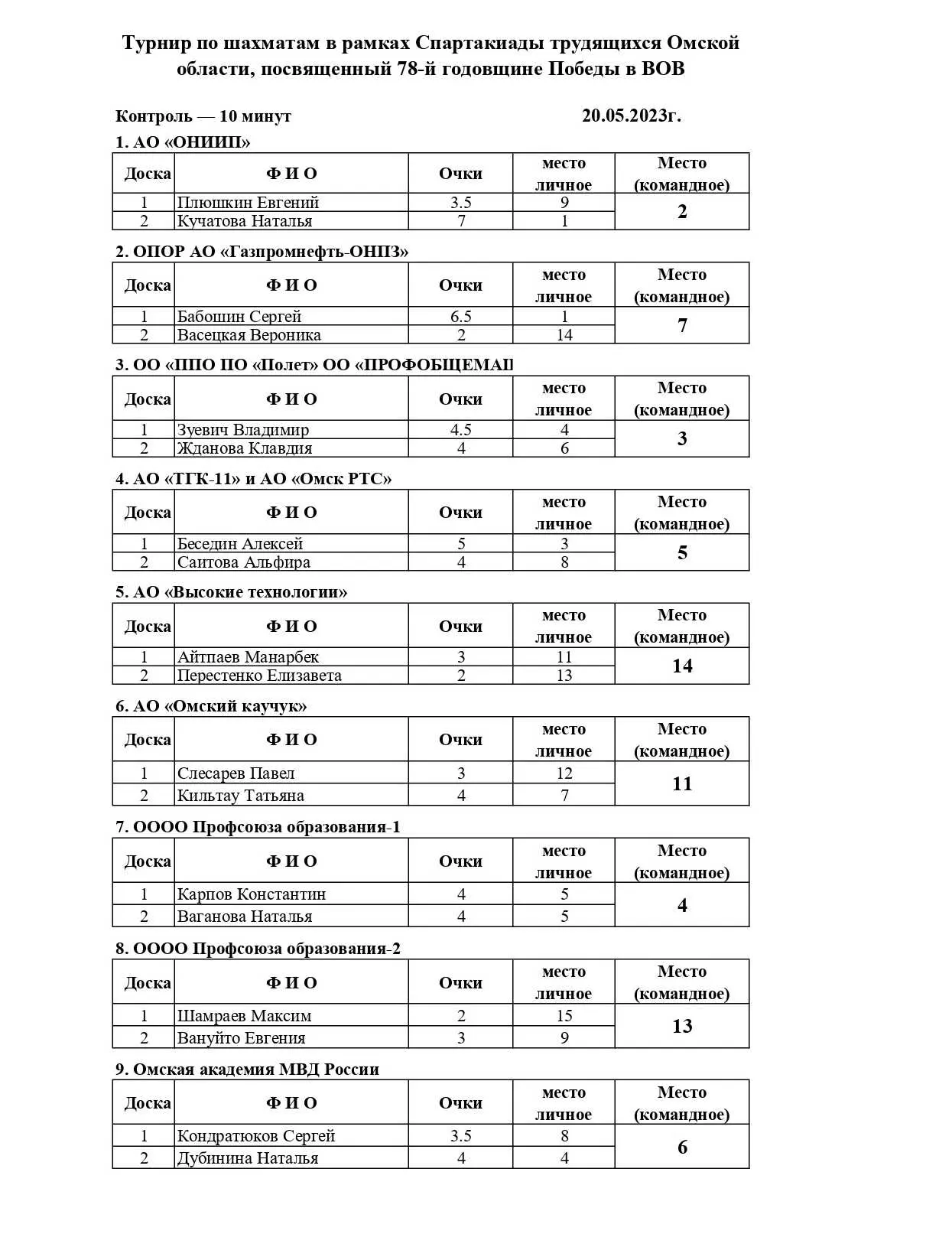 В рамках Спартакиады трудящихся Омской области в ГШК на Дмитриева прошел шахматный турнир, посвященный 78-й годовщине Победы в Великой Отечественной войне. Контроль 10 минут. Туров 7. Количество команд 16. В каждой команде 1 мужская и 1 женская доска.