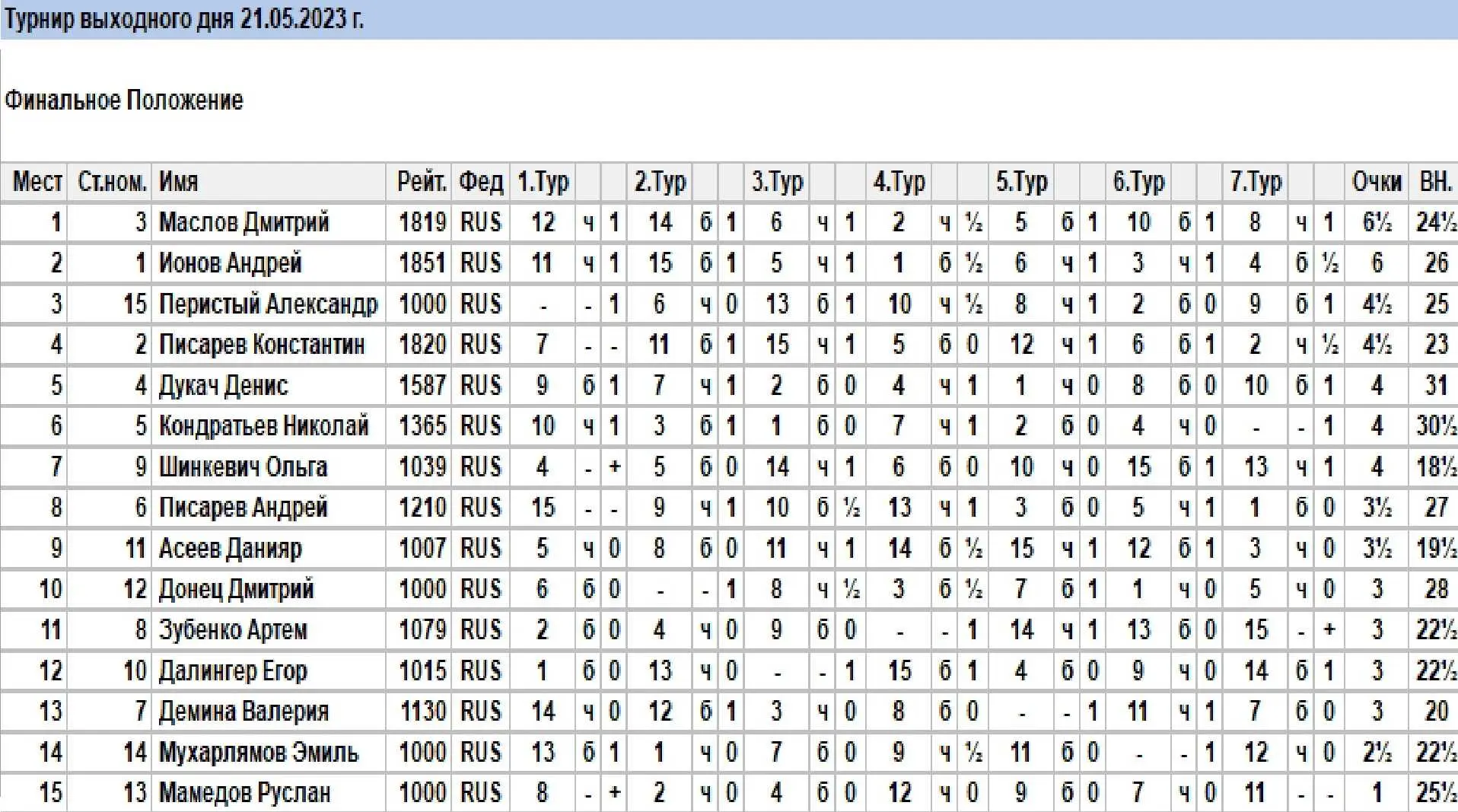 Итоги турнира по быстрым шахматам (21 мая 2023 г.)
