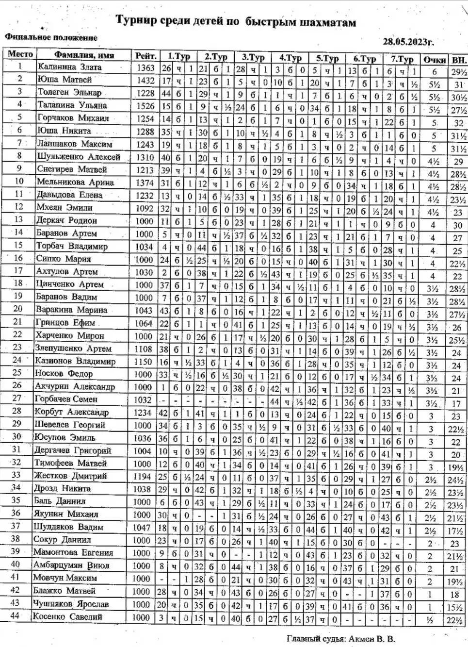 Итоги турнира для детей по быстрым шахматам (28 мая 2023)