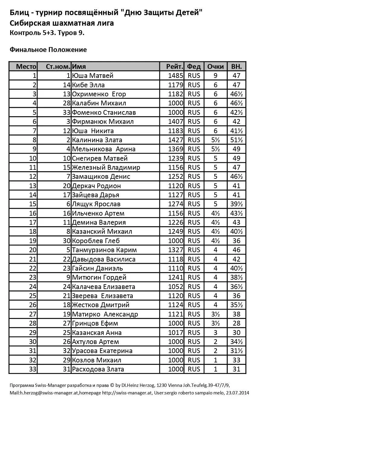 Сибирская шахматная лига провела в ГШК на Дмитриева детский блиц-турнир, посвященный Дню защиты детей. Контроль 5+3. Туров 9. Количество участников 33.