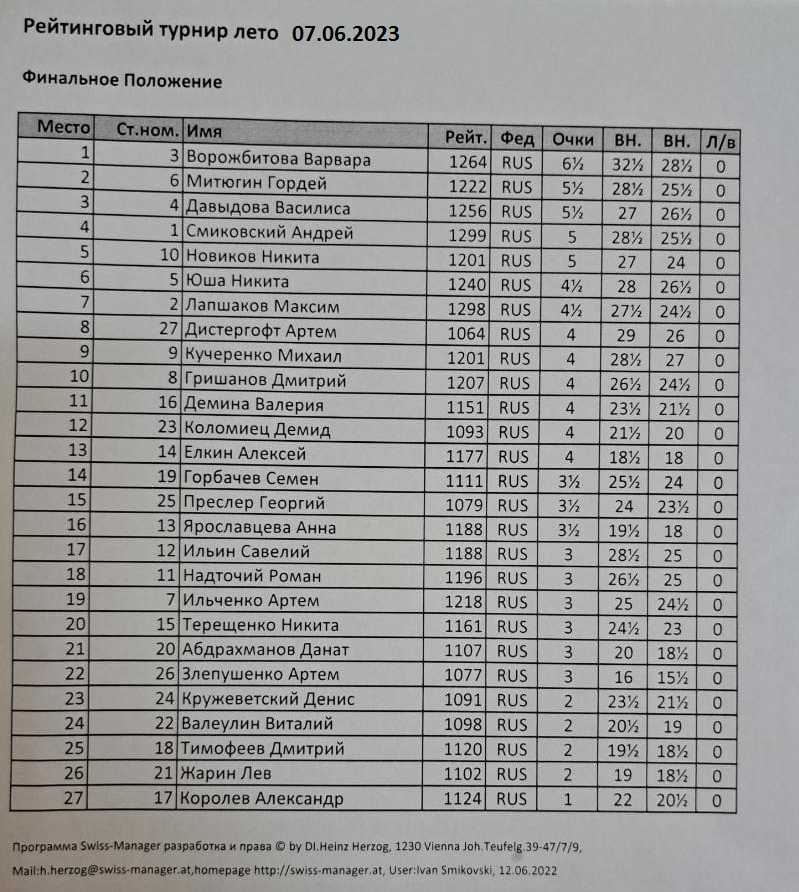 Для учащихся ДЮСШ №15 прошел турнир по быстрым шахматам. Участвовали юные шахматисты с рейтингом ФШР 1050-1300. Контроль 8+3. Туров 7. Количество участников 27.