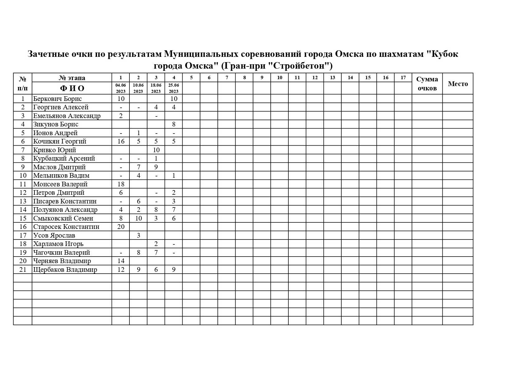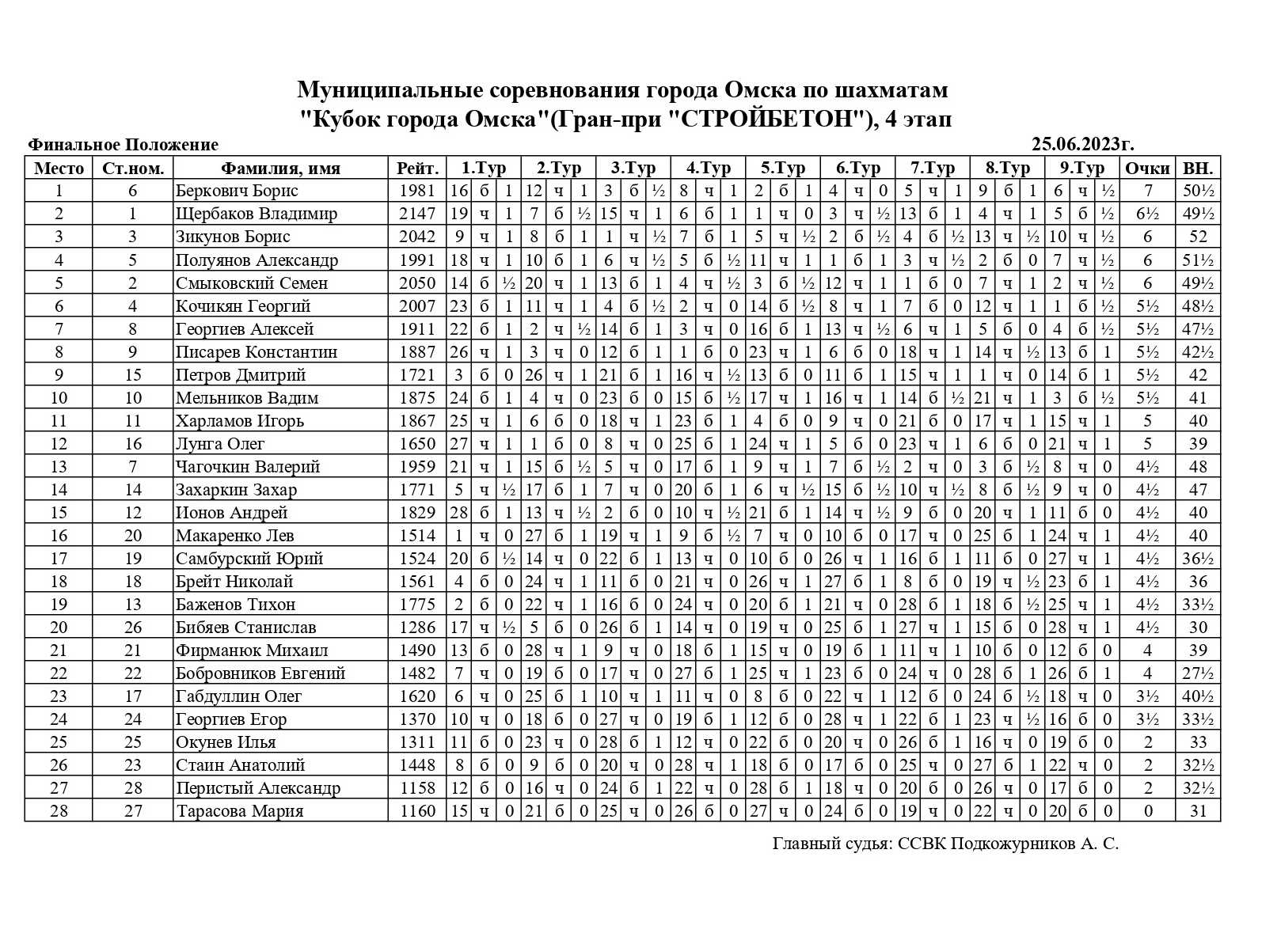 В воскресенье, 25 июня, состоялся четвертый этап Кубка города Омска по быстрым шахматам Гран-при «Стройбетон». Ограничение по рейтингу: ФШР выше 1200. Место проведения: ГШК на Дмитриева. Контроль 8+3. Туров 9. Количество участников 28.