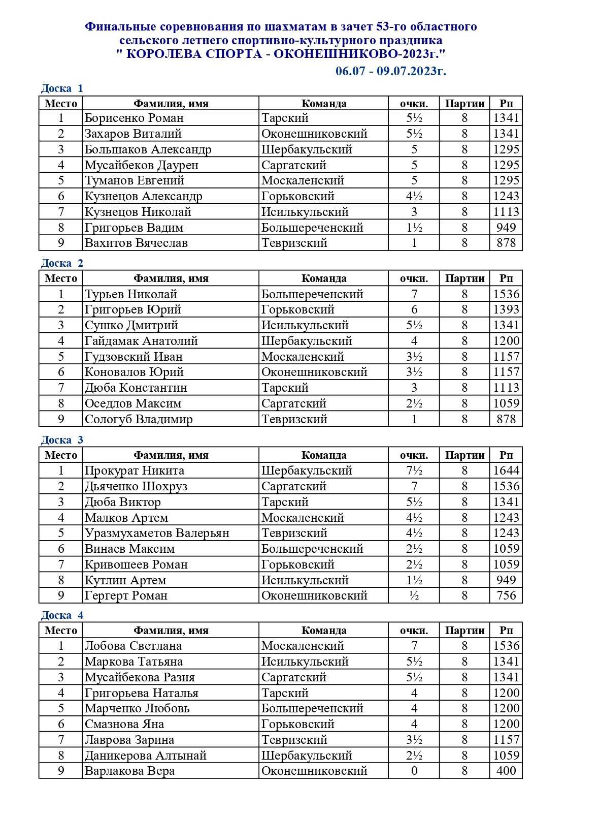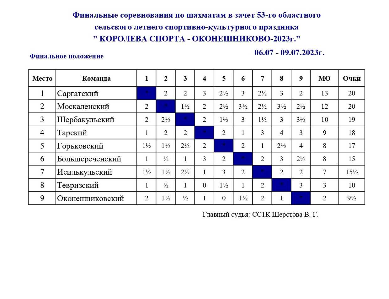 С 6 июля по 9 июля в Омской области прошли финальные соревнования по шахматам в зачет 53-го областного сельского летнего спортивно-культурного праздника «Королева спорта — Оконешниково-2023». Команды из 4 досок, одна из которых женская, играли по круговой системе в классические шахматы с контролем 45+15.