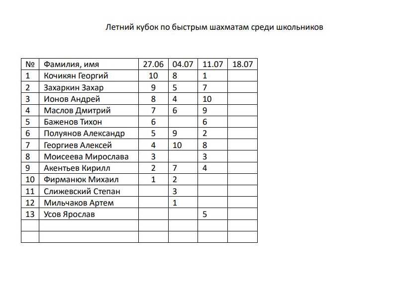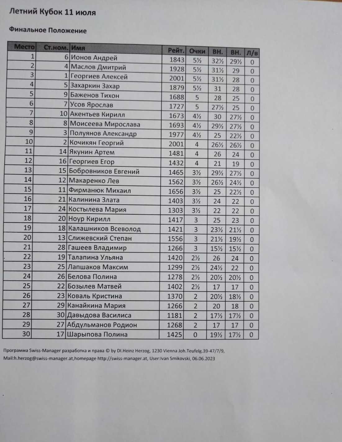 В Спортивной школе №15 г. Омска состоялся третий турнир в рамках Летнего кубка города Омска для сильнейших школьников 2006 года рождения и младше. Контроль 8+3. Туров 7. Количество участников 30.