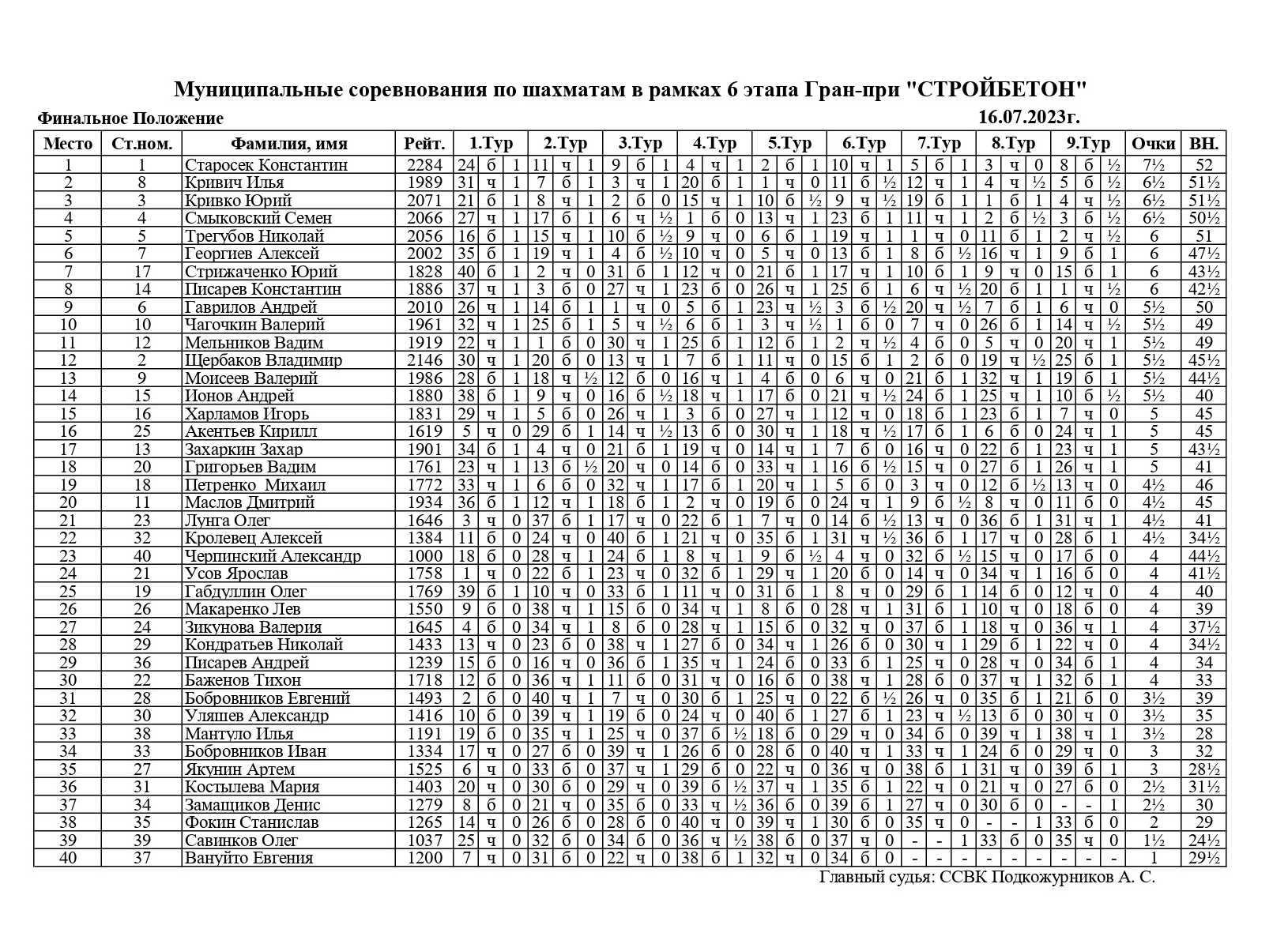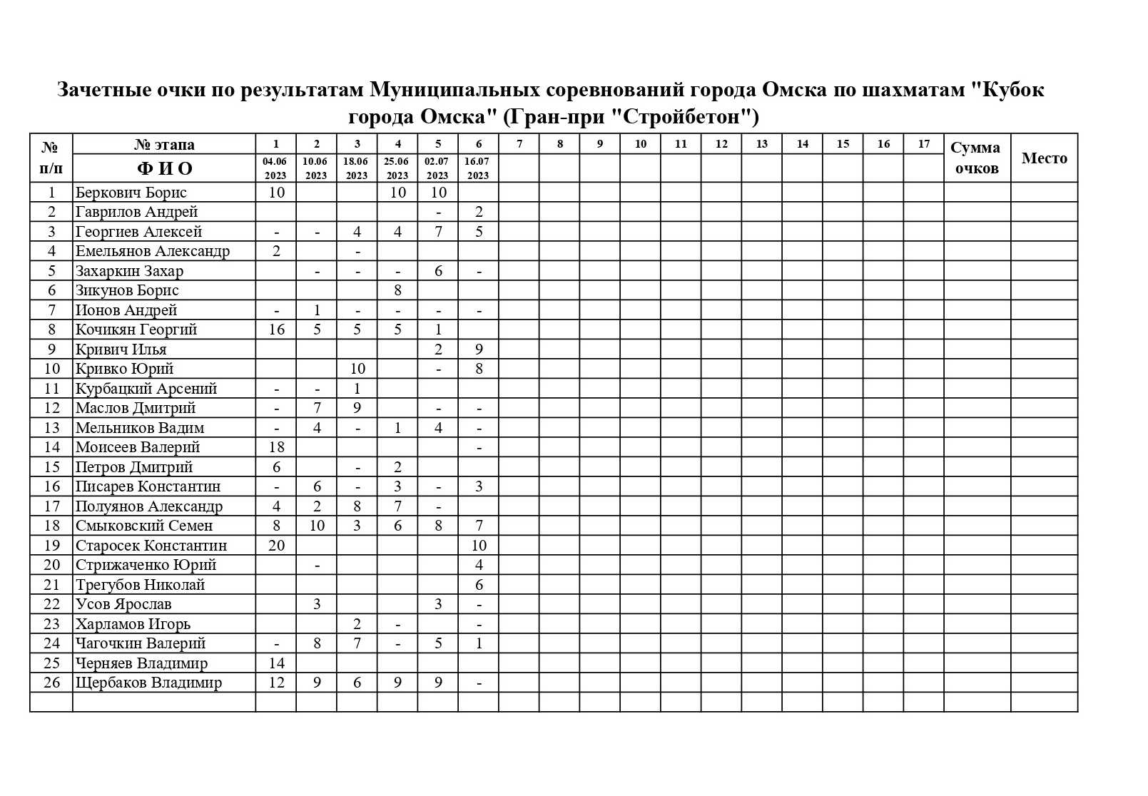 В воскресенье, 16 июля, состоялся шестой этап Кубка города Омска по быстрым шахматам Гран-при «Стройбетон». Ограничение по рейтингу: ФШР выше 1200. Место проведения: ГШК на Дмитриева. Контроль 8+3. Туров 9. Количество участников 40.