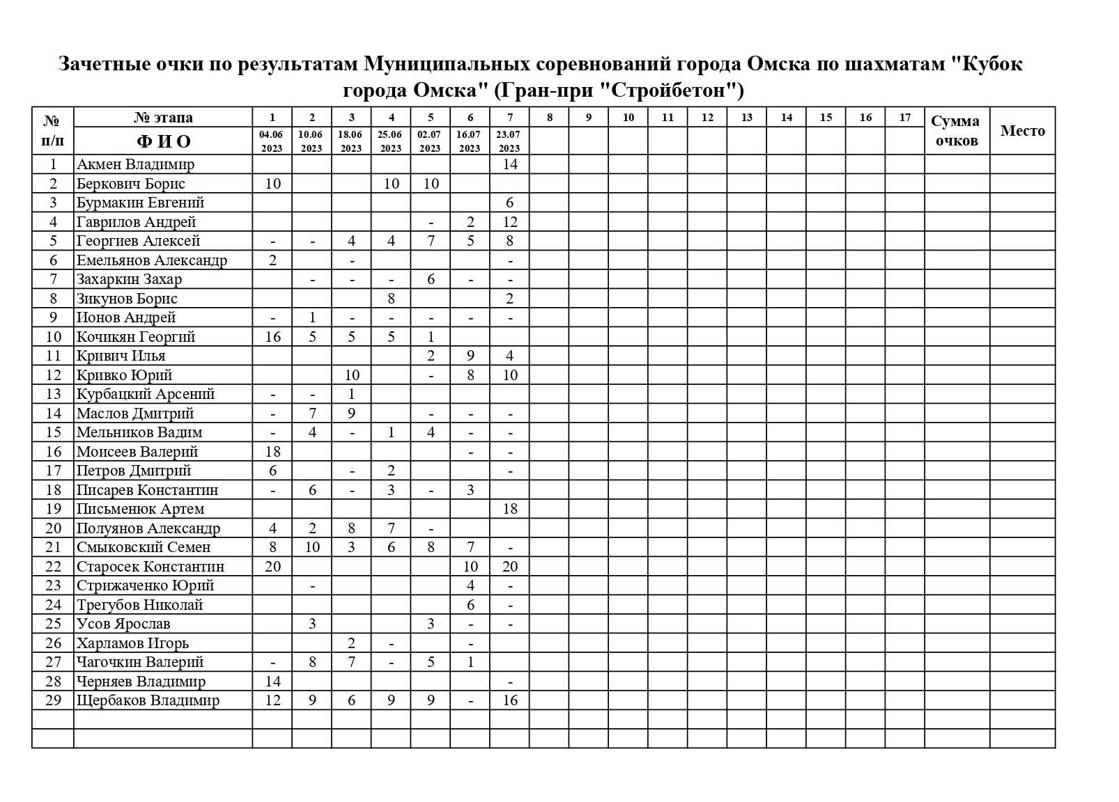 В воскресенье, 23 июля, состоялся седьмой «золотой» этап Кубка города Омска по быстрым шахматам Гран-при «Стройбетон». Ограничение по рейтингу: ФШР выше 1200. Место проведения: общеобразовательная школа №96. Контроль 8+3. Туров 9. Количество участников 80.