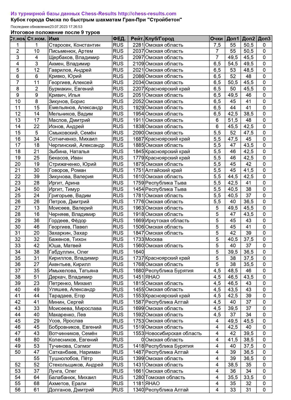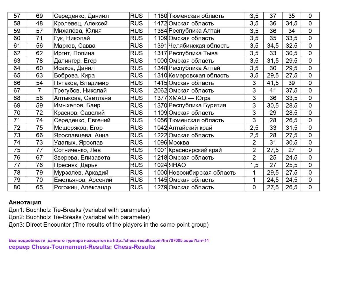 Всего омским шахматистам на этом турнире удалось встретиться за доской с представителями Красноярского края, Алтайского края, Республики Тыва, Иркутской области, Москвы, Республики Бурятия, Ямало-Ненецкого автономного округа, Республики Алтай, Новосибирской области, Томской области, Тюменской области, Челябинской области, Кемеровской области, Ханты-Мансийского автономного округа-Югра.