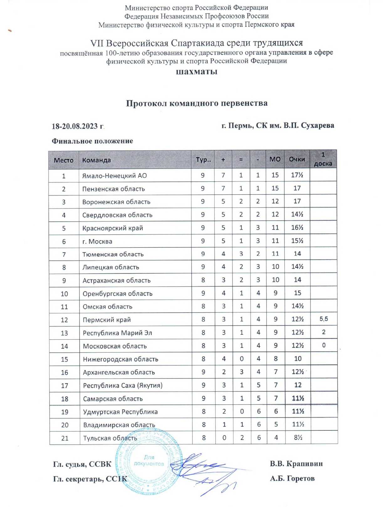 В Перми с 18 по 20 августа 2023 года проходила Седьмая Всероссийская Спартакиада среди трудящихся по разным видам спорта. Для шахматистов был организован командный турнир по швейцарской системе. Состав команды: 2 мужских доски + 1 женская доска. Контроль 15+10. Туров 9. Количество команд 21.