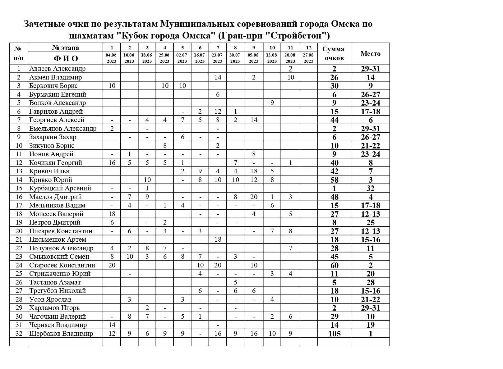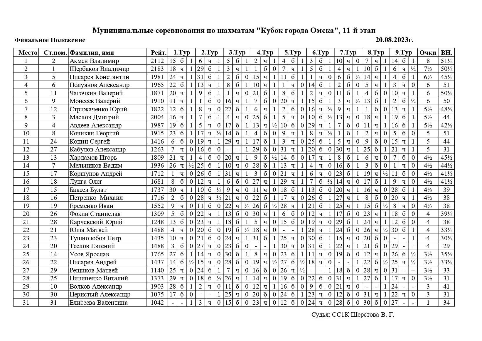 В воскресенье, 20 августа, прошел одиннадцатый этап Кубка города Омска по быстрым шахматам Гран-при «Стройбетон». Ограничение по рейтингу: ФШР выше 1200. Место проведения: филиал ГШК на Масленникова. Контроль 8+3. Туров 9. Количество участников 31.