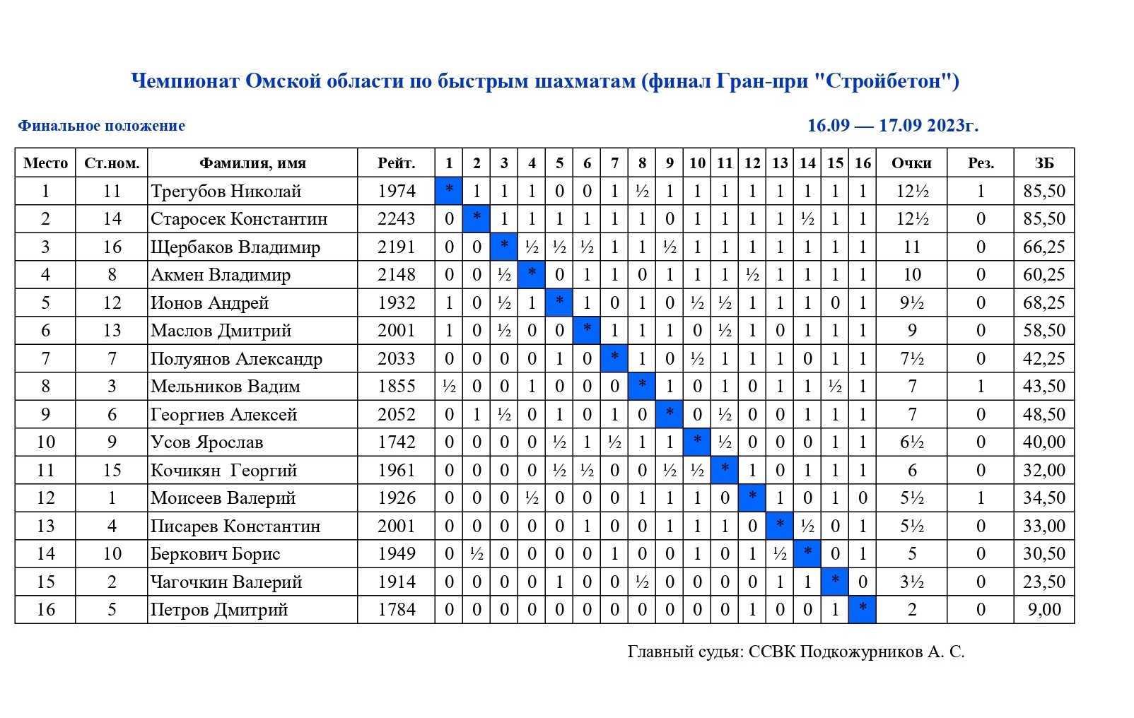 В Омском городском шахматном клубе на Дмитриева 16-17 сентября 2023 года состоялся финал Гран-при «Стройбетон», который носит статус Чемпионата Омской области по быстрым шахматам 2023 года. В итоговый круговой турнир попали сильнейшие игроки по серии отборочных этапов, которые проходили в течение всего лета.
