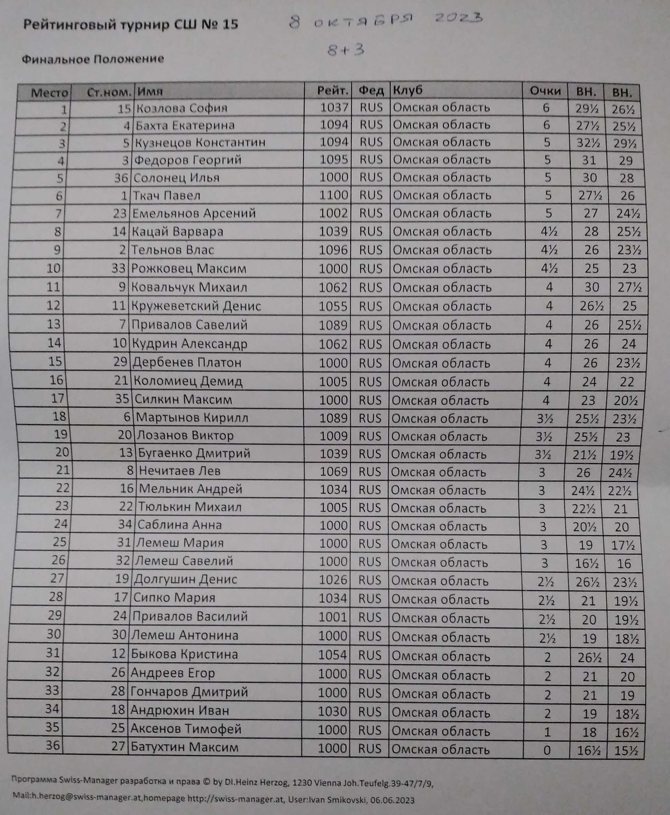 В Спортивной школе №15 состоялся турнир по быстрым шахматам для учащихся с рейтингом ФШР до 1100. Контроль 8+3. Туров 7. Количество участников 36.