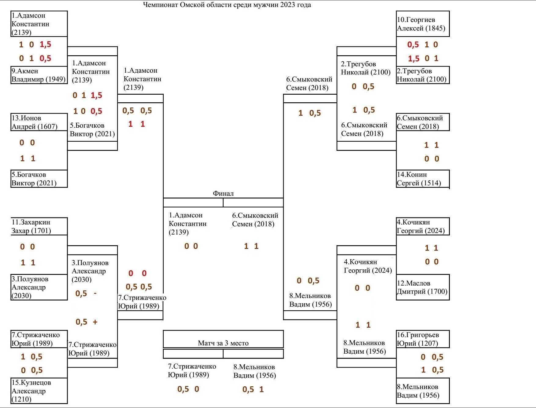 Юный Семён Смыковский в матче за 1 место нанес поражение Константину Адамсону в обеих партиях и стал Чемпионом Омской области среди мужчин 2023 года.