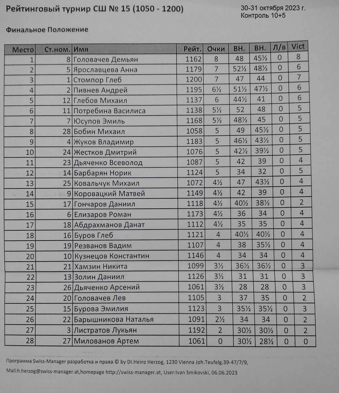 В Спортивной школе №15 в дни школьных каникул состоялся турнир по быстрым шахматам для учащихся с рейтингом ФШР от 1050 до 1200. Контроль 10+5. Туров 9. Количество участников 28.