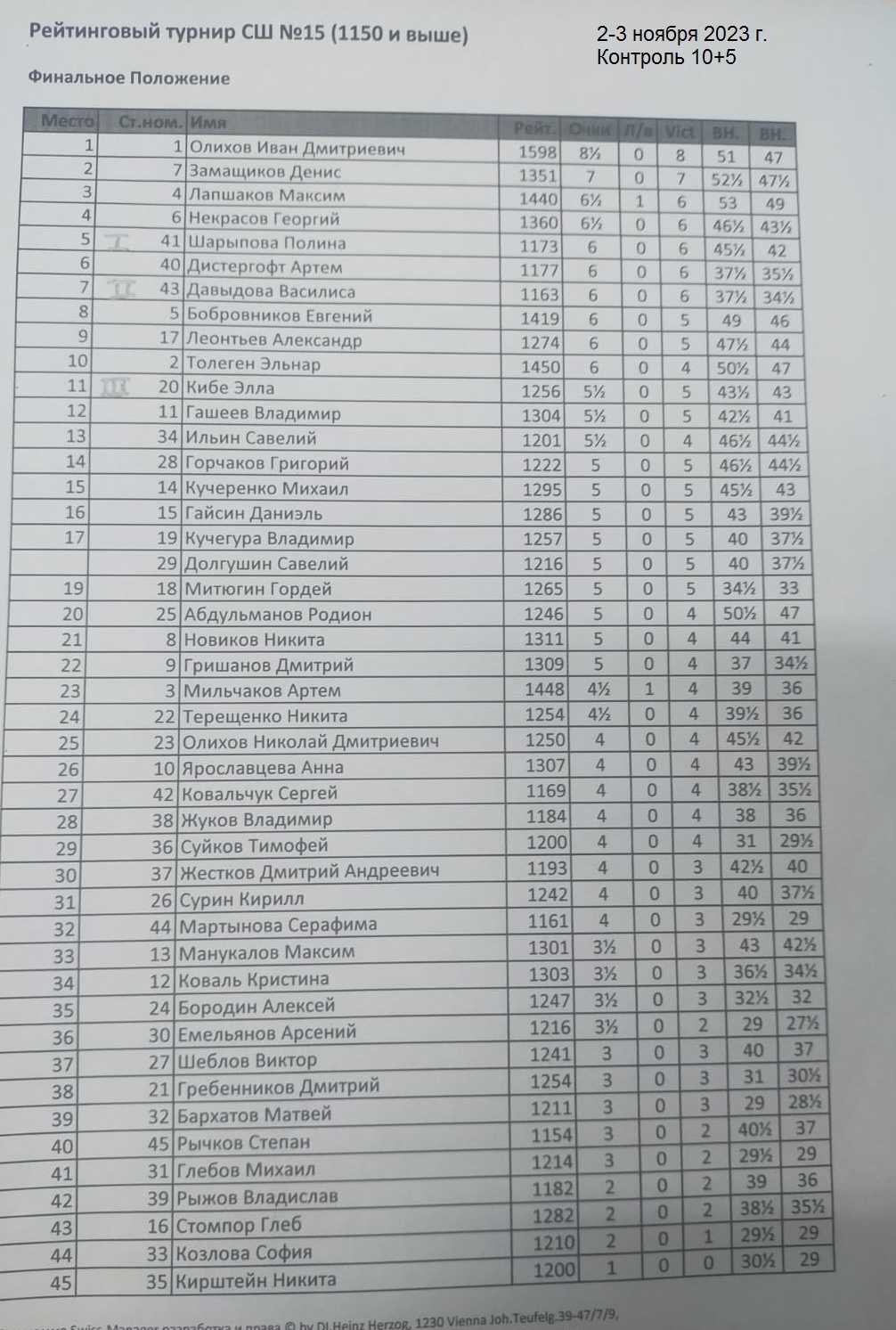 В Спортивной школе №15 прошел двухдневный турнир по быстрым шахматам для воспитанников спортшколы с рейтингом ФШР выше 1150. Контроль 10+5. Туров 9. Количество участников 45.