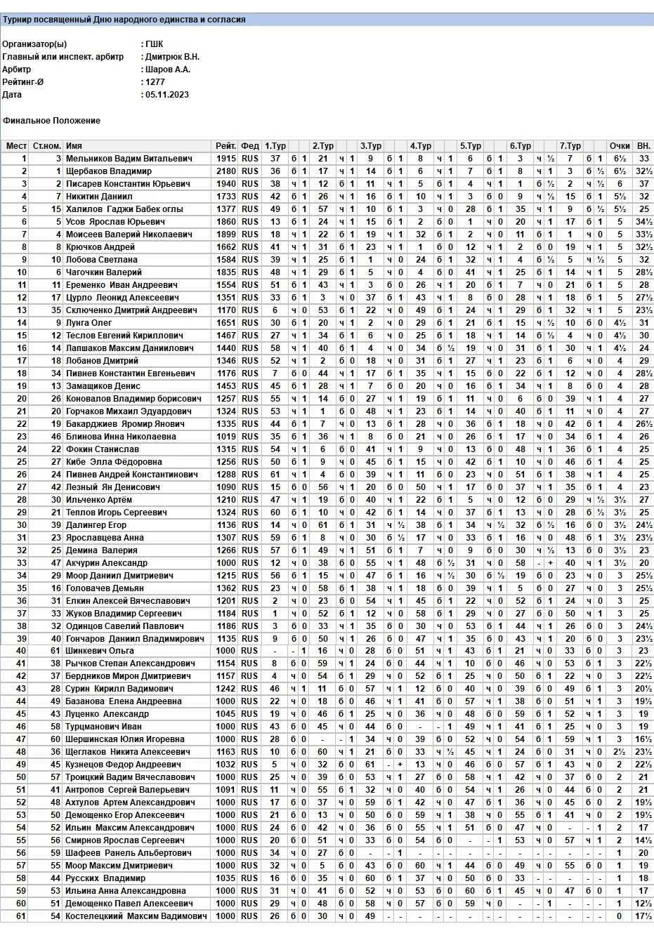 В ГШК на Дмитриева прошел турнир по быстрым шахматам для всех желающих к Дню народного единства. Контроль 10+5. Туров 7. Количество участников 61.