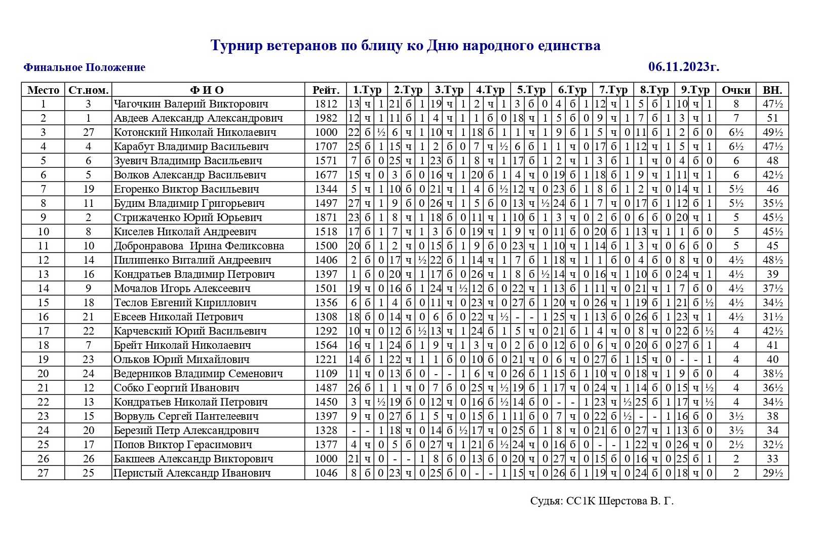 В филиале ГШК на Масленникова для представителей старшего поколения состоялся блиц-турнир, посвященный Дню народного единства. Контроль 5+3. Туров 9. Количество участников 27.