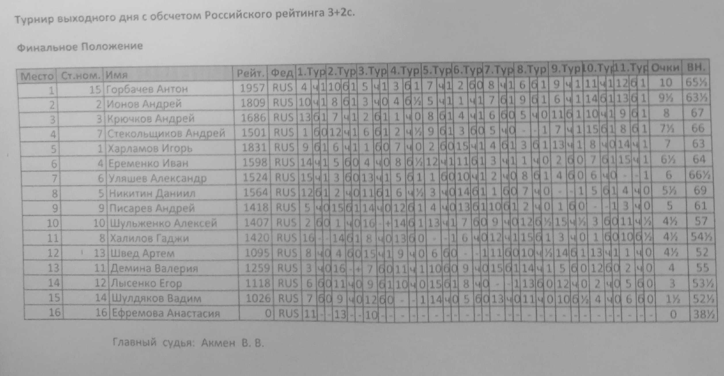 В ГШК на Дмитриева прошел субботний блиц-турнир для всех желающих. Контроль 3+2. Туров 11. Количество участников 16.