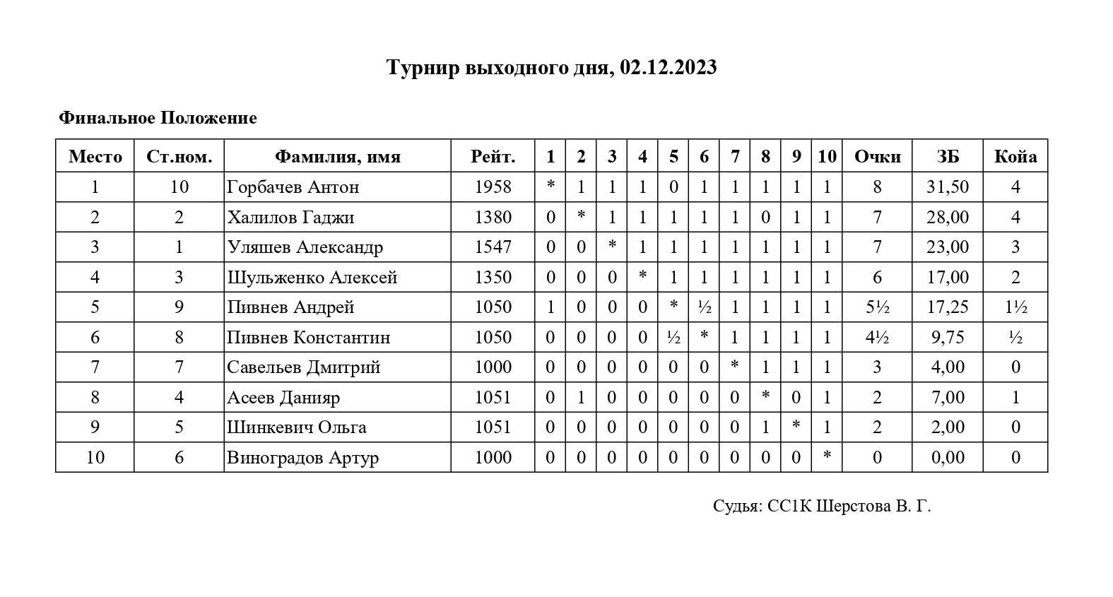 В Городском шахматном клубе на Дмитриева состоялся турнир выходного дня по блицу для всех желающих. Контроль 5+3. Количество участников 10. Круговая система.