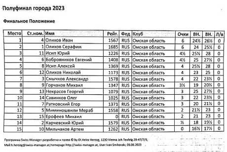 Прекрасно прошли турнир три брата Олиховы: Серафим, Иван и Николай, - которые в последнем туре играли на первых досках. В итоге Иван и Серафим набрали по 6 очков из 7, оторвавшись от третьего места на 1,5 очка. Дополнительный показатель сыграл на руку Ивану, он стал победителем полуфинала города Омска, который проходил в Спортивной школе №15.