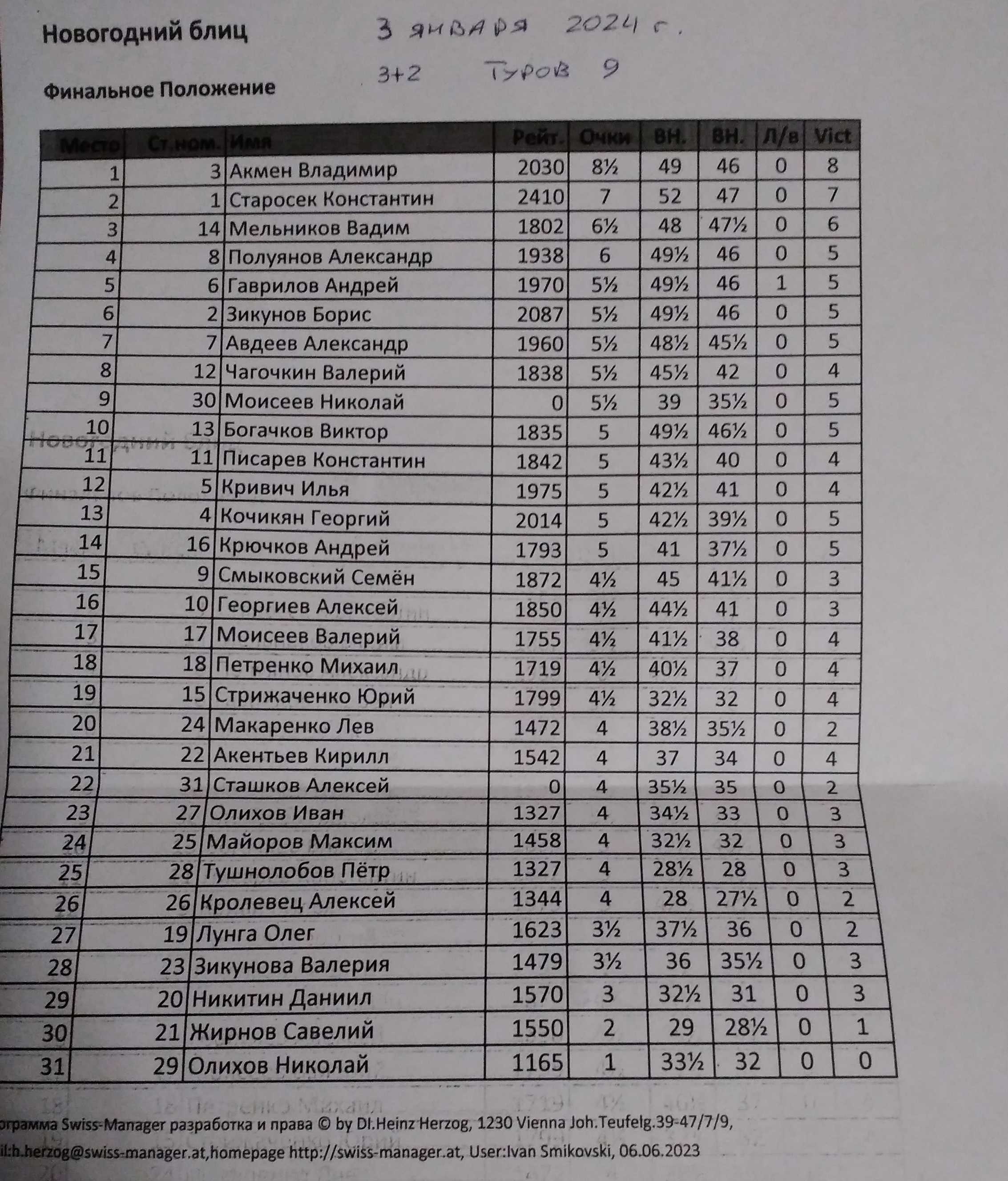 После собрания прошел новогодний блиц-турнир. Контроль 3+2. Количество участников 31. Туров 9. Награждались пять первых мест, а также участники по номинациям.