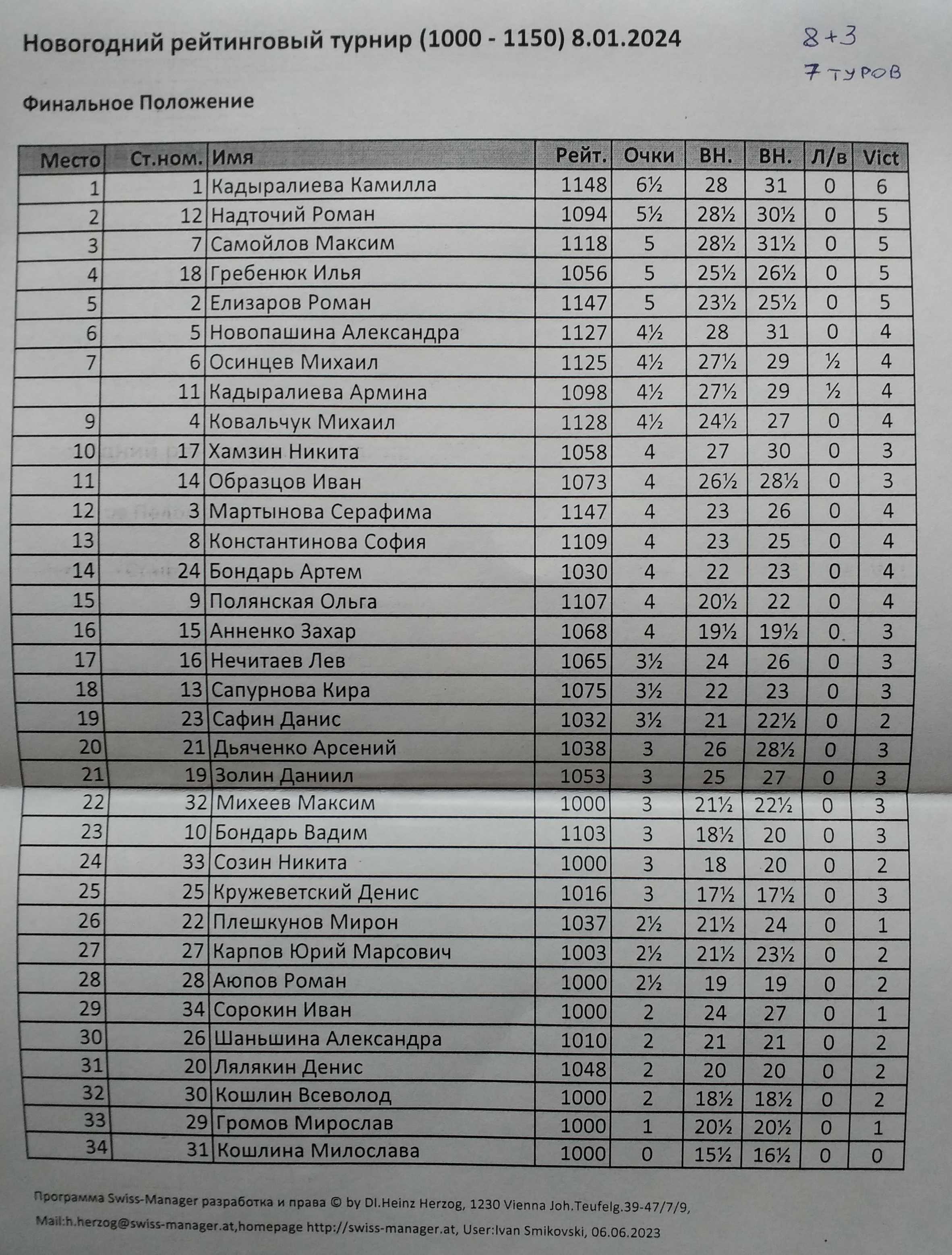 В Спортивной школе №15 состоялся турнир по быстрым шахматам для учащихся с рейтингом ФШР от 1000 до 1150. Контроль 8+3. Туров 7. Количество участников 34.