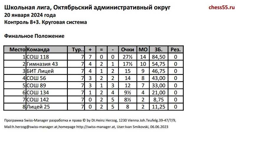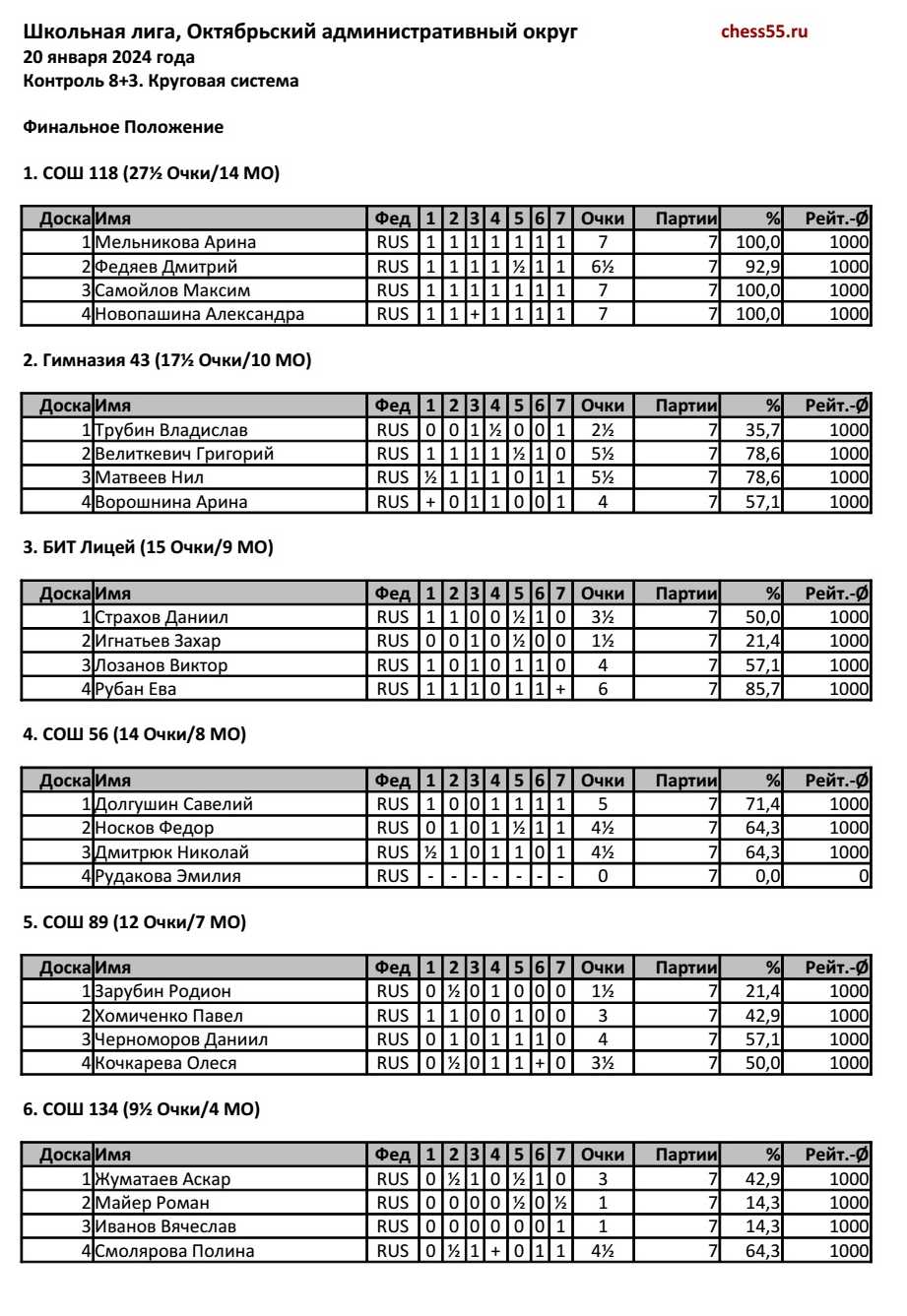 В субботу, 20 января 2024 года, на базе школы №118 прошел окружной этап командного первенства «Школьная лига» по шахматам. В турнире по быстрым шахматам за выход на городской этап участвовали 8 школьных команд Октябрьского административного округа города Омска. Состав команды: 3 доски (мальчики) + 1 доска (девочки). Круговая система. Контроль 8+3.