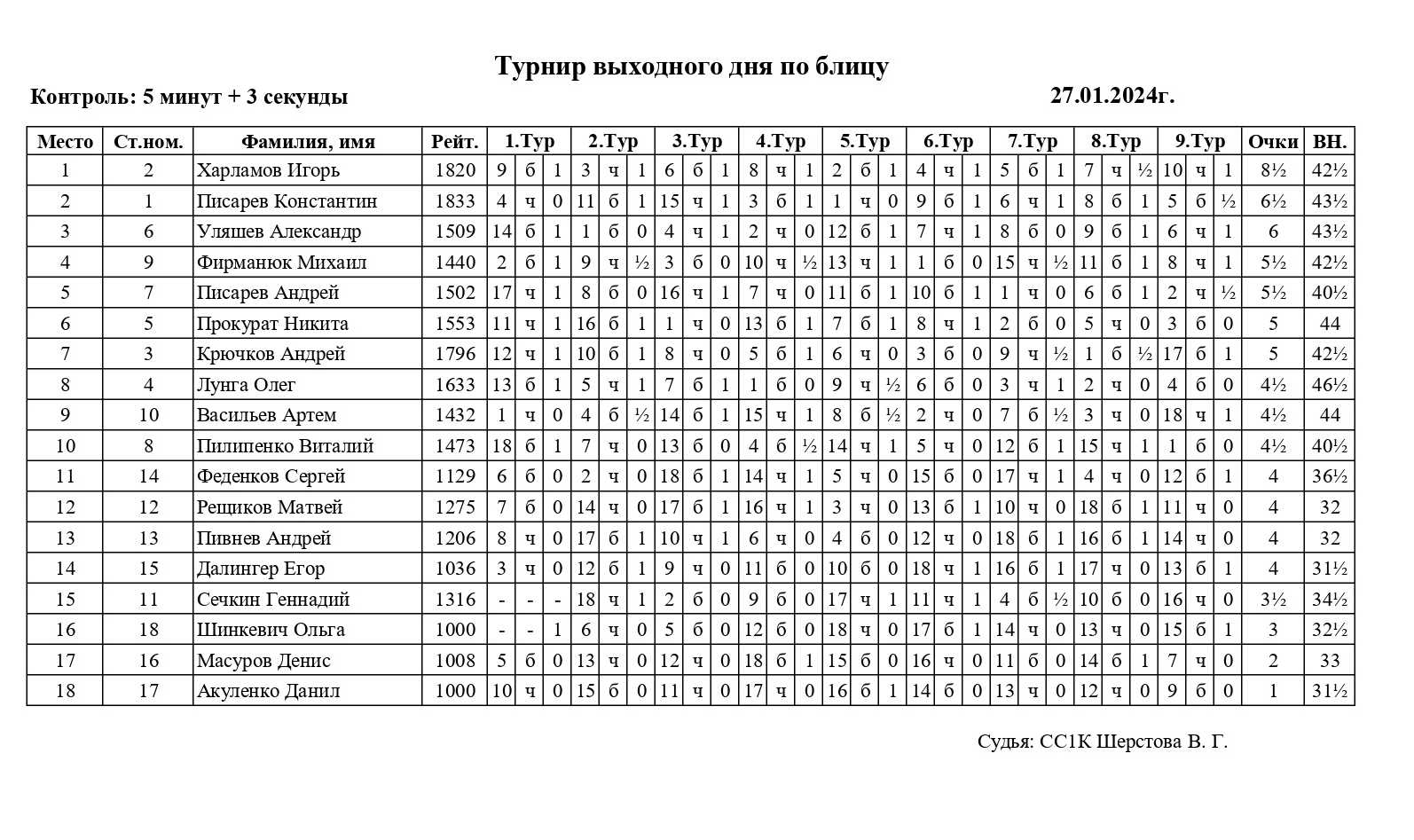 В ГШК на Дмитриева прошел турнир выходного дня по блицу для всех желающих. Контроль 5+3. Туров 9. Количество участников 18.