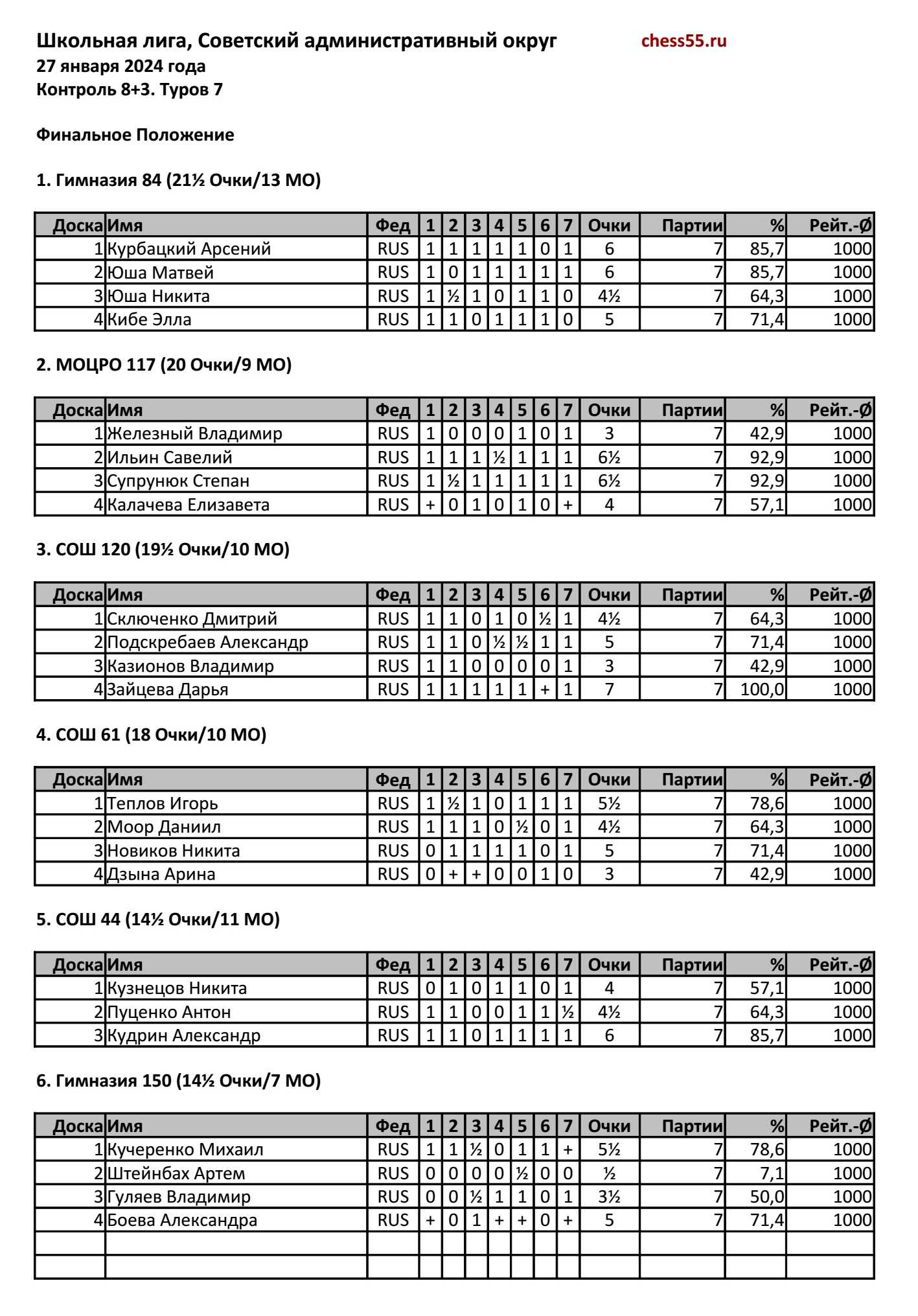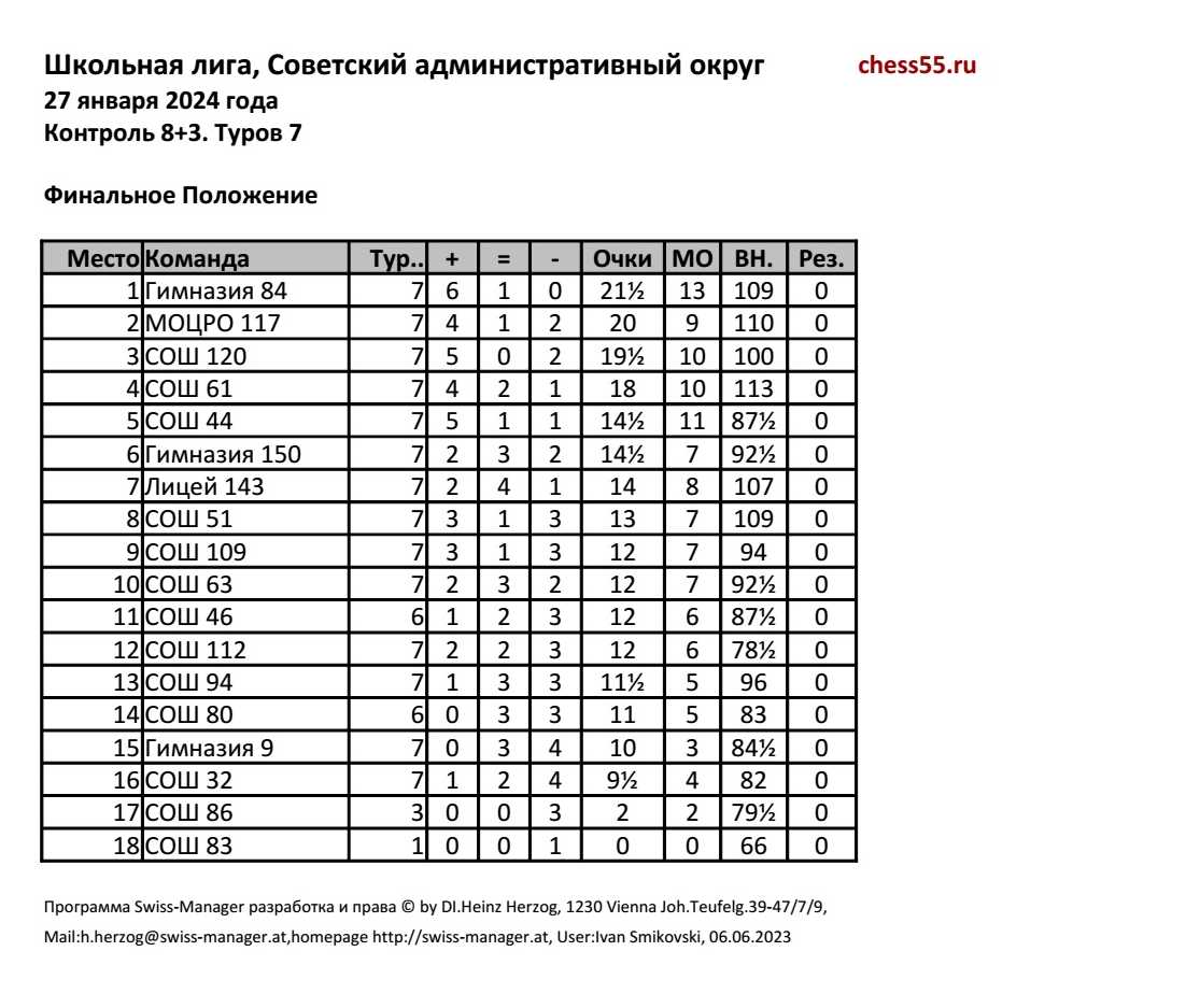 В субботу, 27 января 2024 года, на базе гимназии №84 прошел окружной этап командного первенства «Школьная лига» по шахматам. В турнире по быстрым шахматам за выход на городской этап участвовали 18 школьных команд Советского административного округа города Омска. Состав команды: 3 доски (мальчики) + 1 доска (девочки). Контроль 8+3. Туров 7.