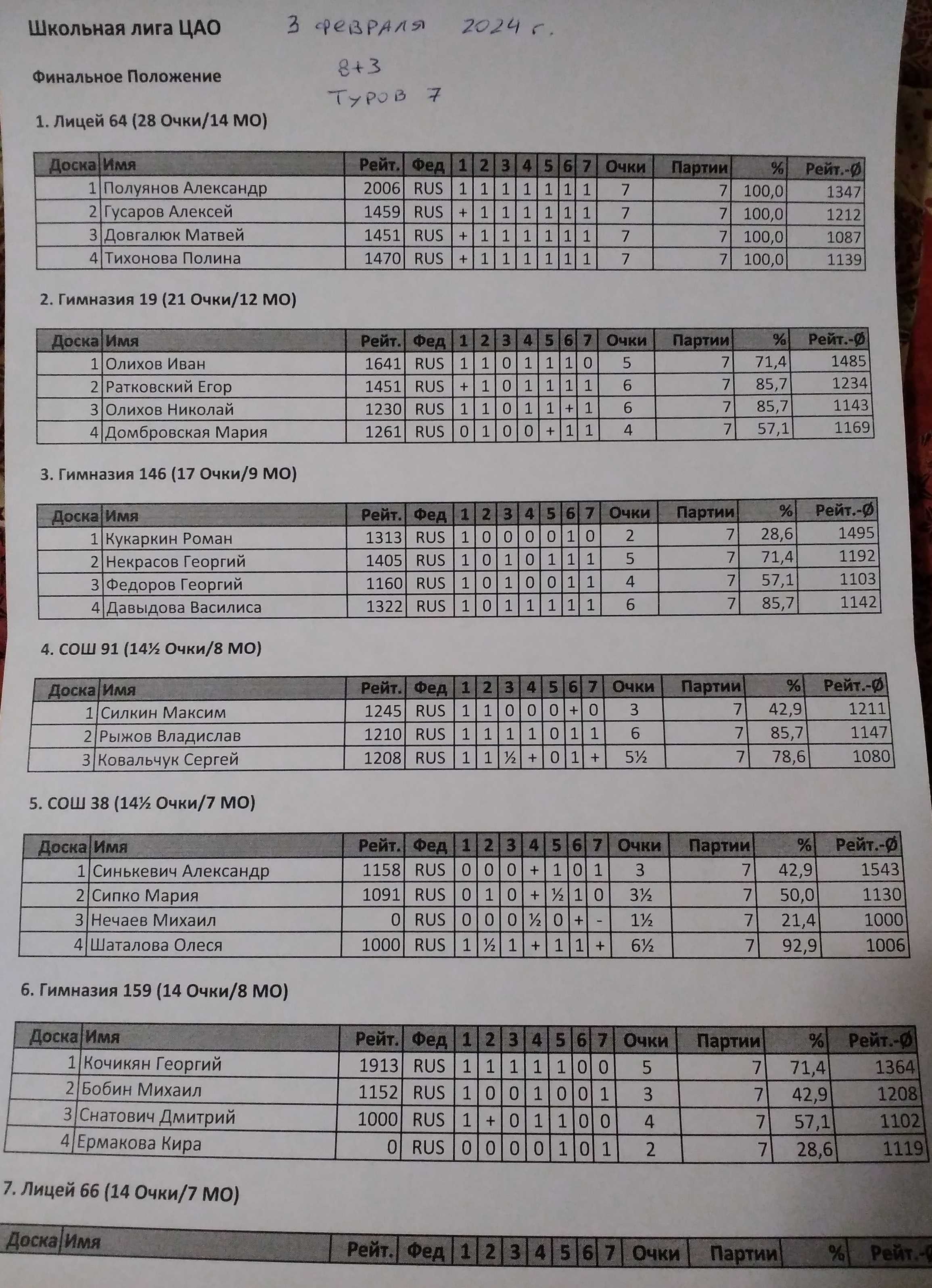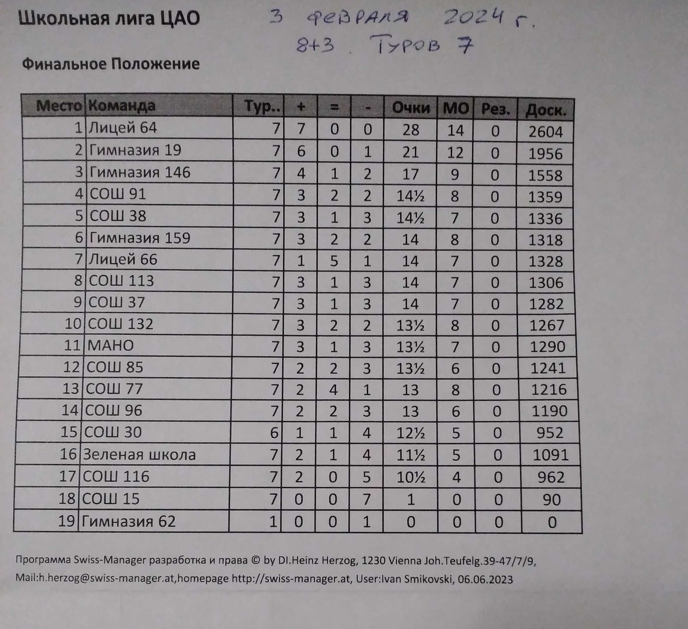 В субботу, 3 февраля 2024 года, в Спортивной школе №15 прошел окружной этап командного первенства «Школьная лига» по шахматам. В турнире по быстрым шахматам за выход на городской этап участвовали 19 школьных команд Центрального административного округа города Омска. Состав команды: 3 доски (мальчики) + 1 доска (девочки). Контроль 8+3. Туров 7.