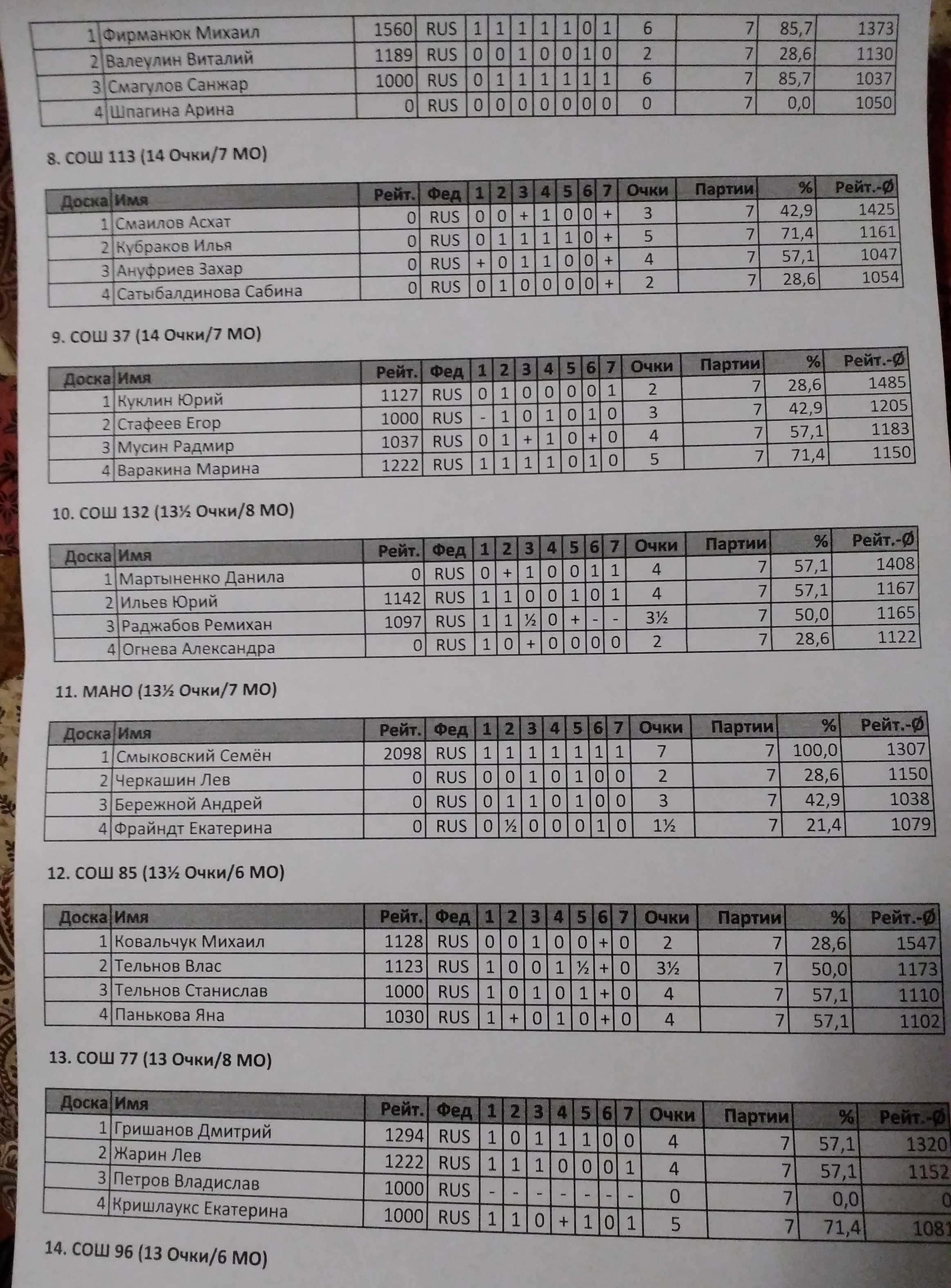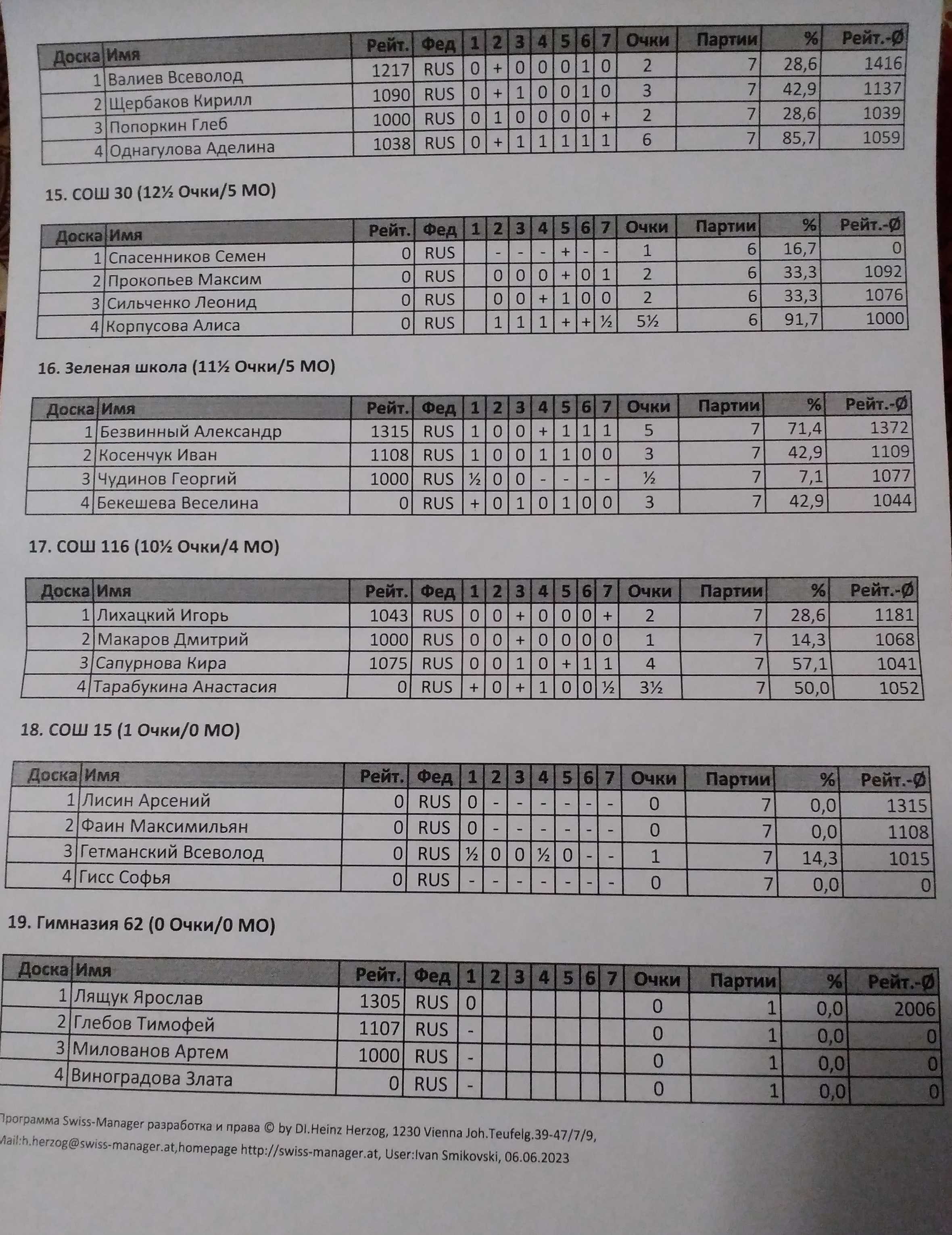 Учащиеся лицея №64 выиграли все партии и с отрывом в семь очков заняли первое место. Ставшая второй команда гимназии №19 финишировала с комфортным отрывом в четыре очка от третьего места. Именно эти общеобразовательные учреждения будут представлять Центральный административный округ города Омска в финальных соревнованиях.