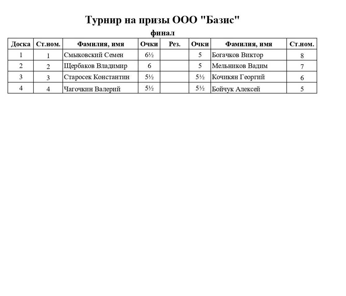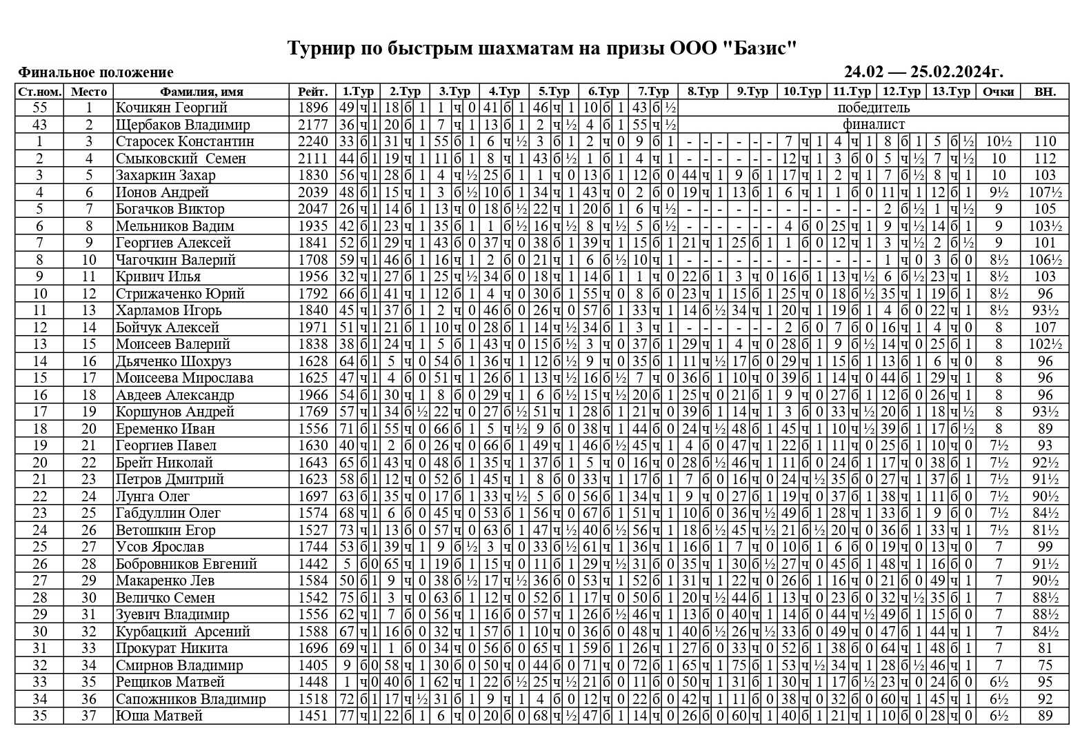 В Омском городском шахматном клубе на Дмитриева 24-25 февраля 2024 года прошел традиционный турнир по быстрым шахматам на призы компании «Базис». В первый день соревнований по итогам 7 туров определялась восьмерка сильнейших для выхода в олимпийскую систему. Во второй день — победители матчей двигались по сетке к первому месту, а проигравшие вылетали в швейцарку, которая продолжалась для всех остальных участников.