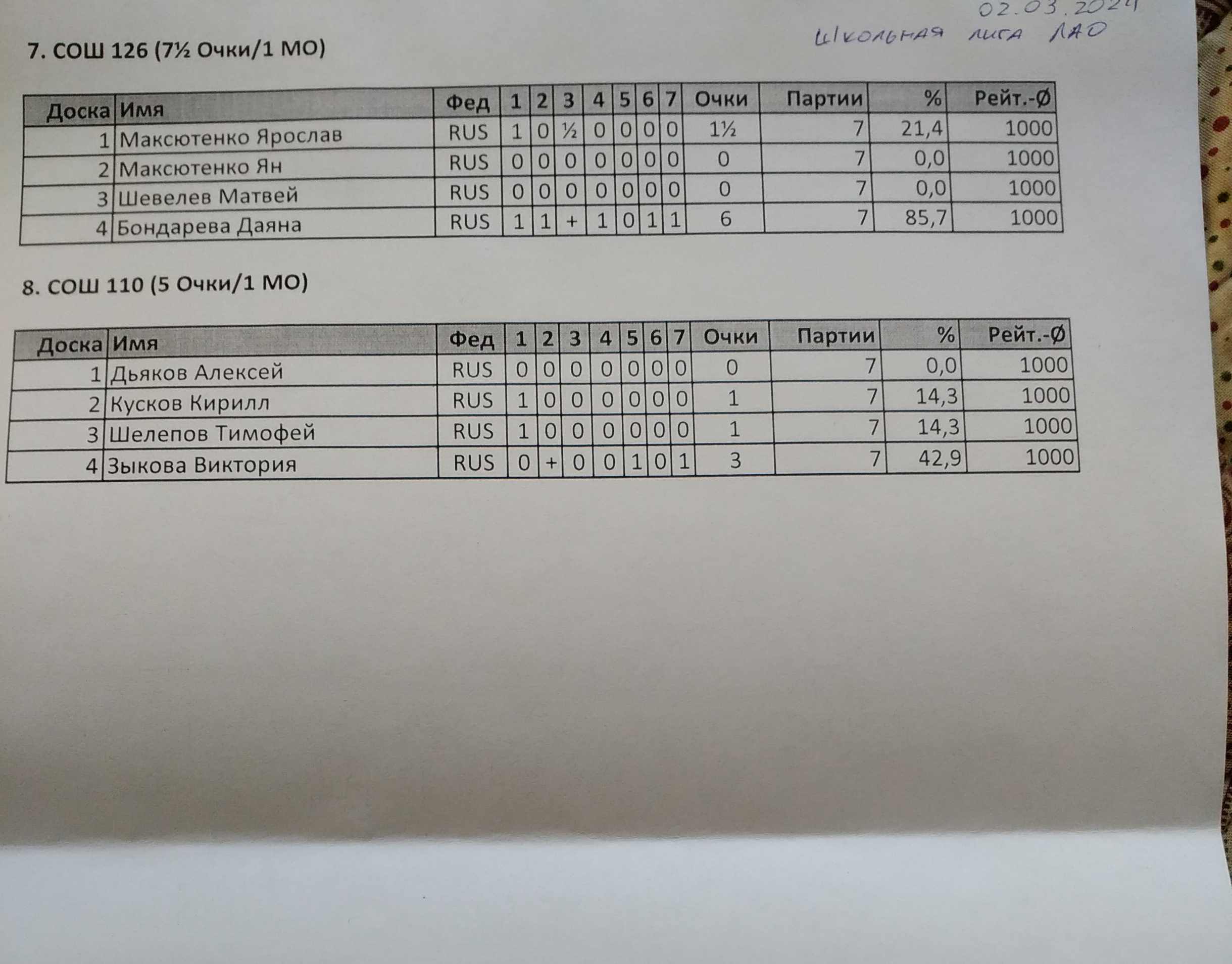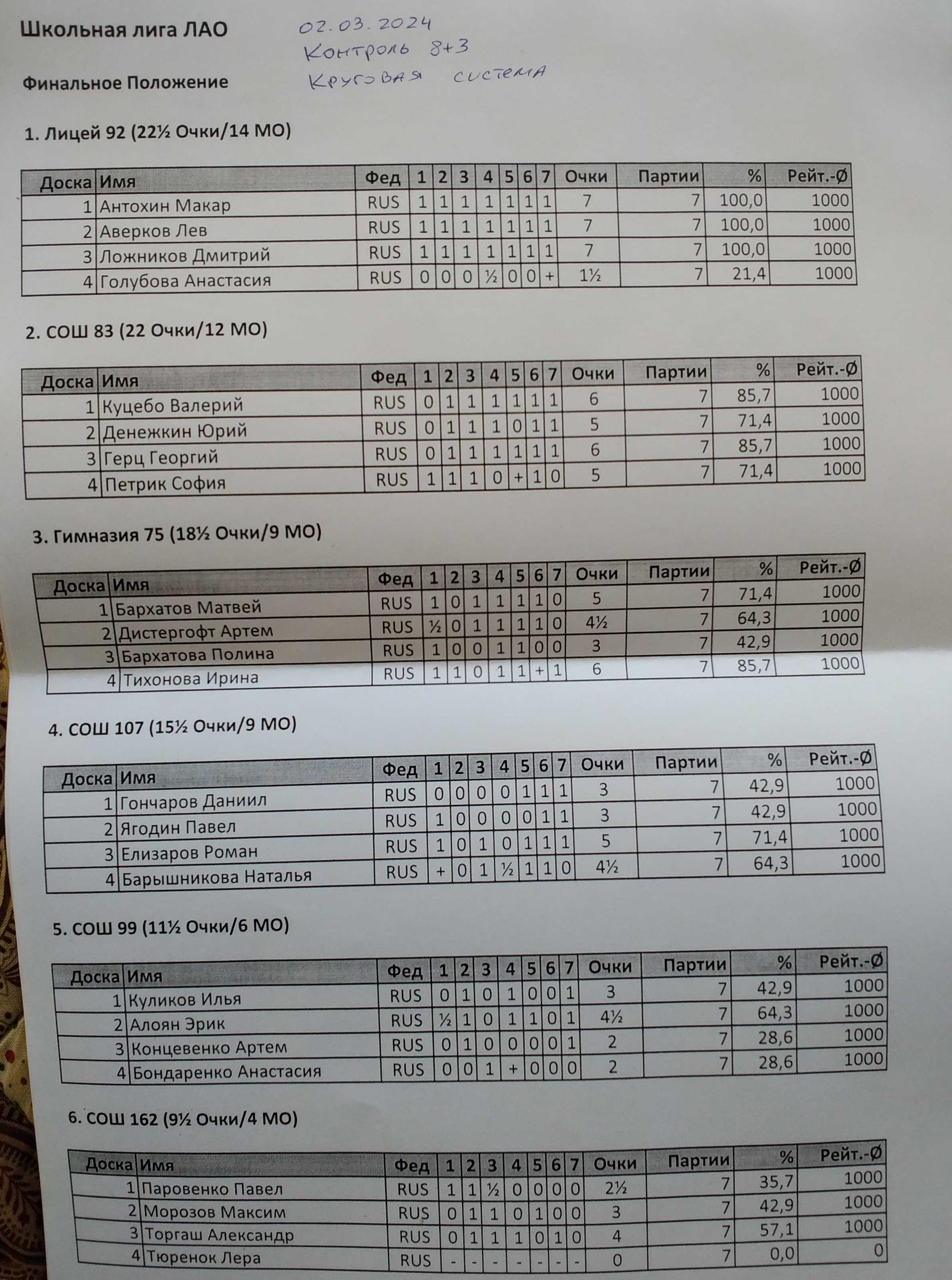 Состав команды: 3 доски (мальчики) + 1 доска (девочки). Контроль 8+3. Количество команд 8. Круговая система.