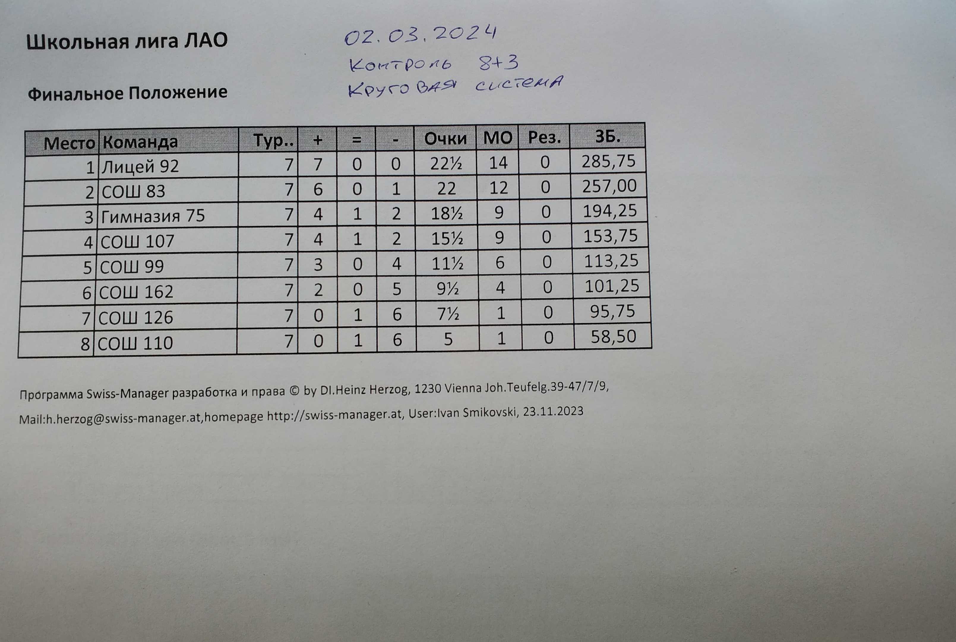 В субботу, 2 марта 2024 года, в Лицее №92 прошел заключительный отборочный этап командного первенства «Школьная лига» по шахматам. Учащиеся общеобразовательных учреждений Ленинского административного округа города Омска боролись за право играть в финале городских соревнований. Для этого надо было занять 1 или 2 место в турнире по быстрым шахматам.