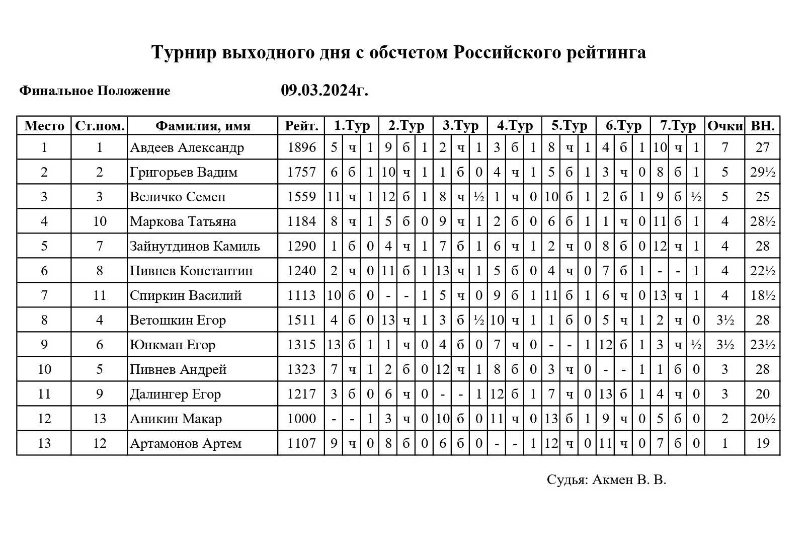 В ГШК на Дмитриева 9 марта 2024 года для всех желающих прошел воскресный рапид. Контроль 10+5. Туров 7. Количество участников 13.