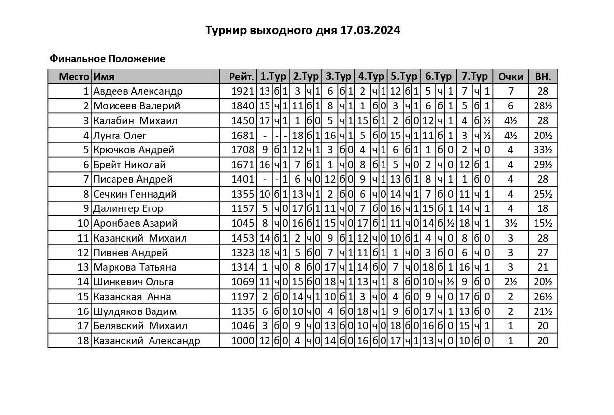В ГШК на Дмитриева 17 марта 2024 года состоялся турнир выходного дня по быстрым шахматам для всех желающих. Контроль 10+5. Туров 7. Количество участников 18.