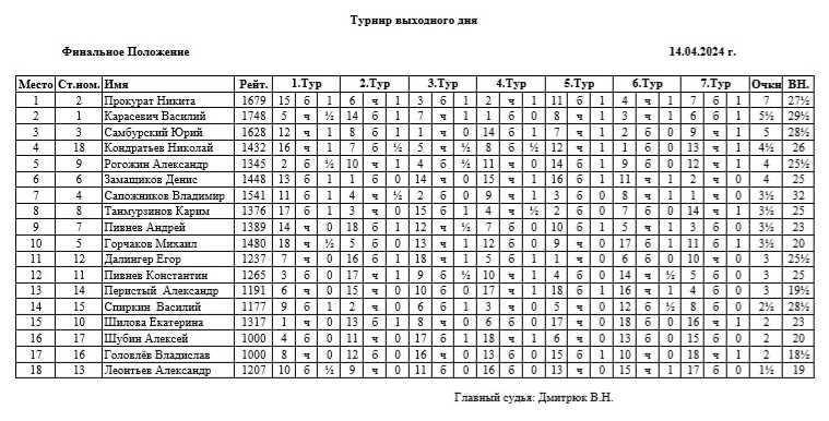 В ГШК на Дмитриева 14 апреля 2024 года прошел турнир выходного дня по быстрым шахматам для всех желающих. Контроль 10+5. Туров 7. Количество участников 18.