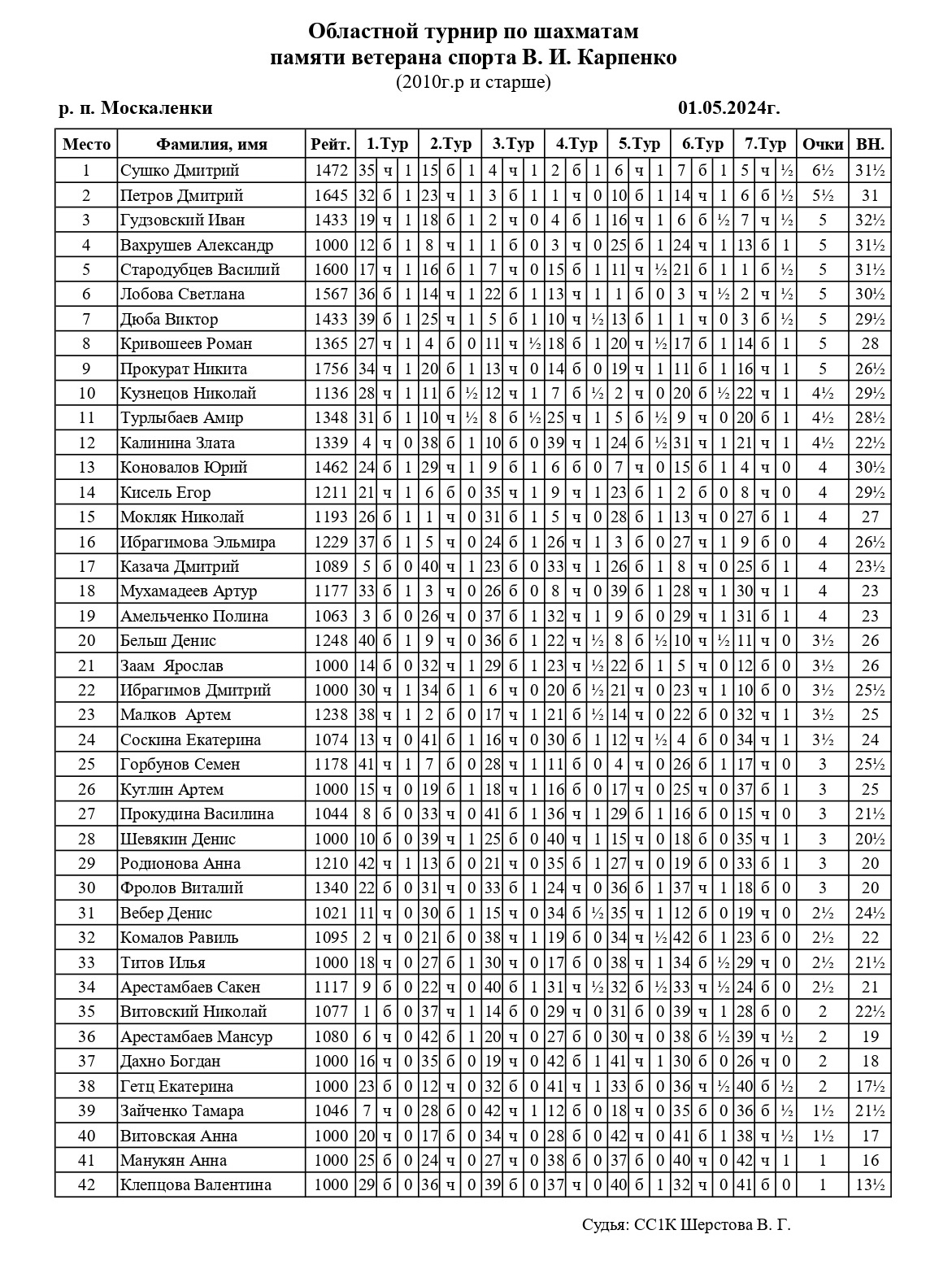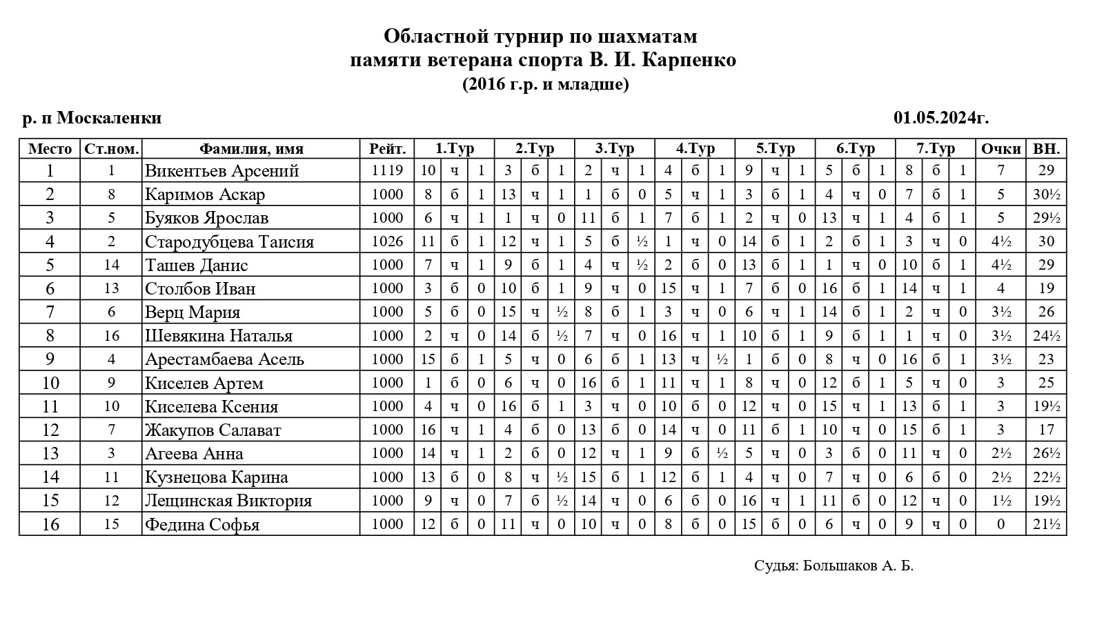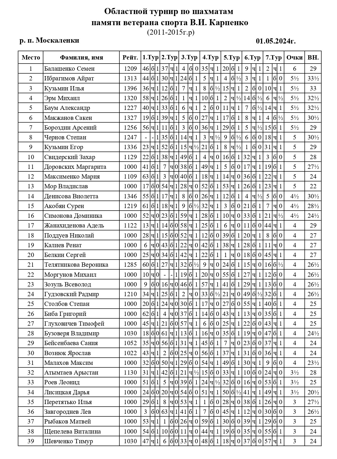 В День весны и труда в р.п. Москаленки Омской области прошел традиционный областной турнир по быстрым шахматам памяти ветерана спорта Виктора Ивановича Карпенко. Участники были разделены на 3 турнира в зависимости от возраста: взрослый турнир (2010 г.р. и старше), дети 2011-2015 годов рождения и самые юные шахматисты (2016 г.р. и младше). Контроль 10+5. Туров 7