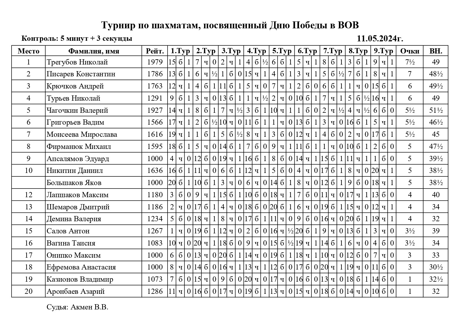 В ГШК на Дмитриева в субботу, 11 мая 2024 года, состоялся праздничный блиц-турнир, посвященный 79-й годовщине Победы в Великой Отечественной войне.