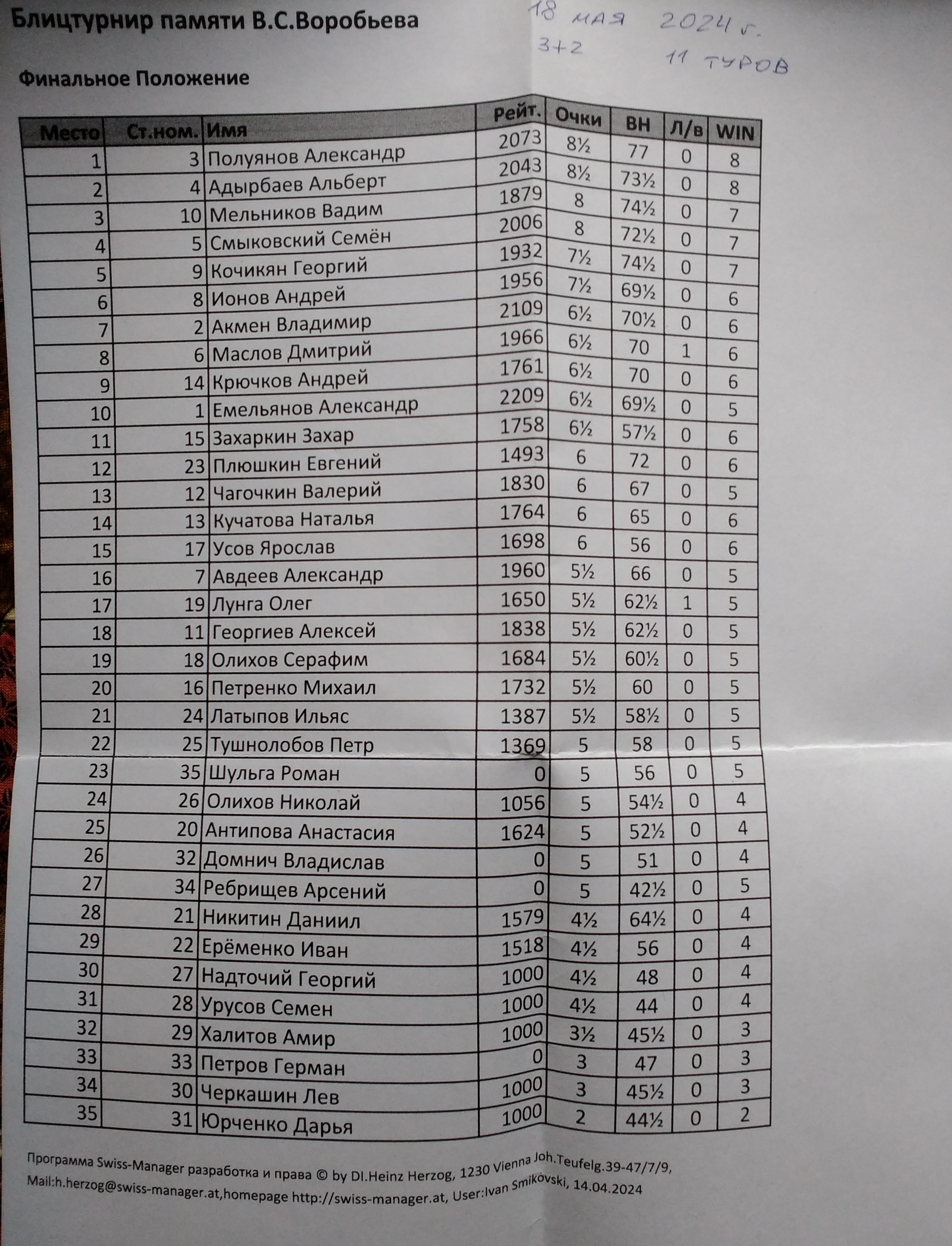 В шестом корпусе Омского государственного университета им. Ф.М.Достоевского 18 мая 2024 года состоялся X блиц-турнир памяти Валерия Семеновича Воробьева.